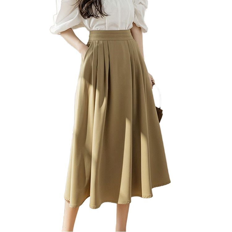 Korean French Casual A-line Umbrella Skirt with Feathers Halflength Mid Length Over Knee Pocket Folded Large Swing Skirt