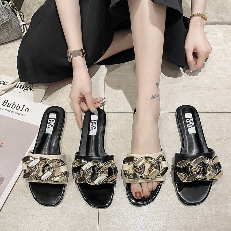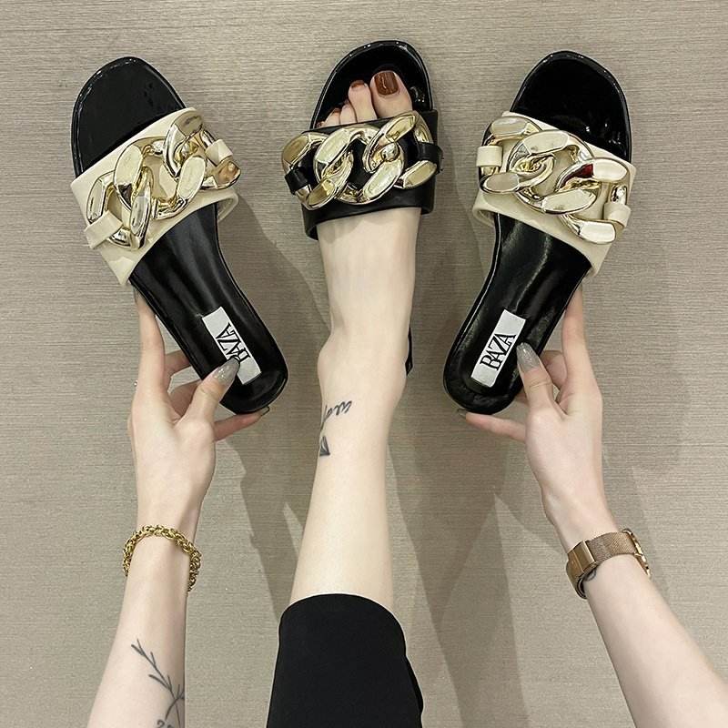 Coreano ultima estate metallo OAutersole donna Pu pantofole scorrevoli in pelle catena d'oro scarpe basse aggiungi il mio Logo nome sui sandali da donna
