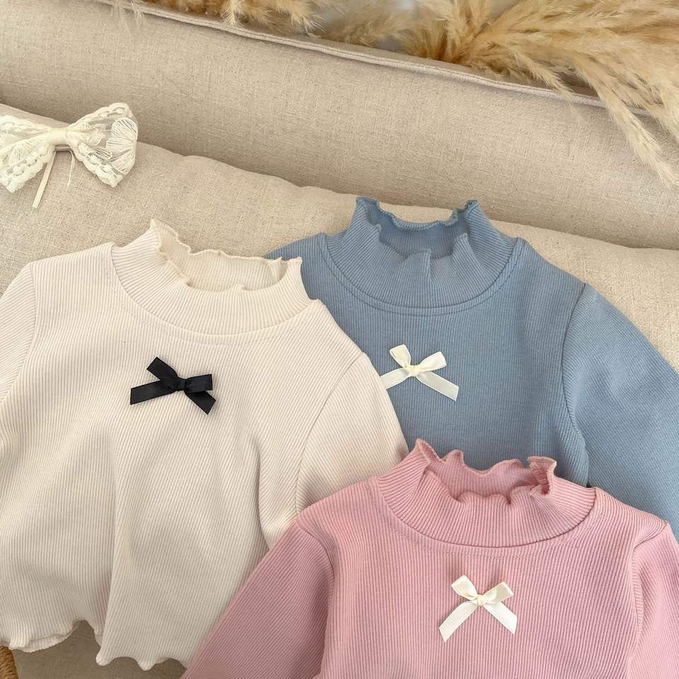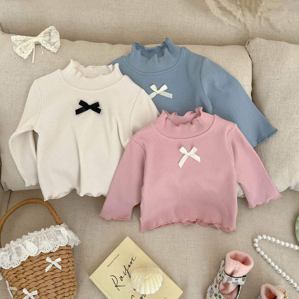 Korean Style Instagram New Cotton Long Sleeves Half-High Collar Base Shirt Ruffled Edge Bow T-shirt Lace Trim Spring Autumn