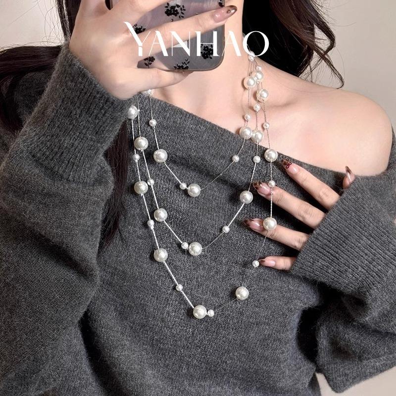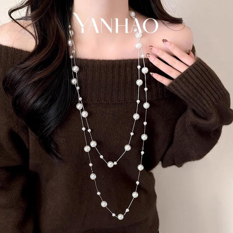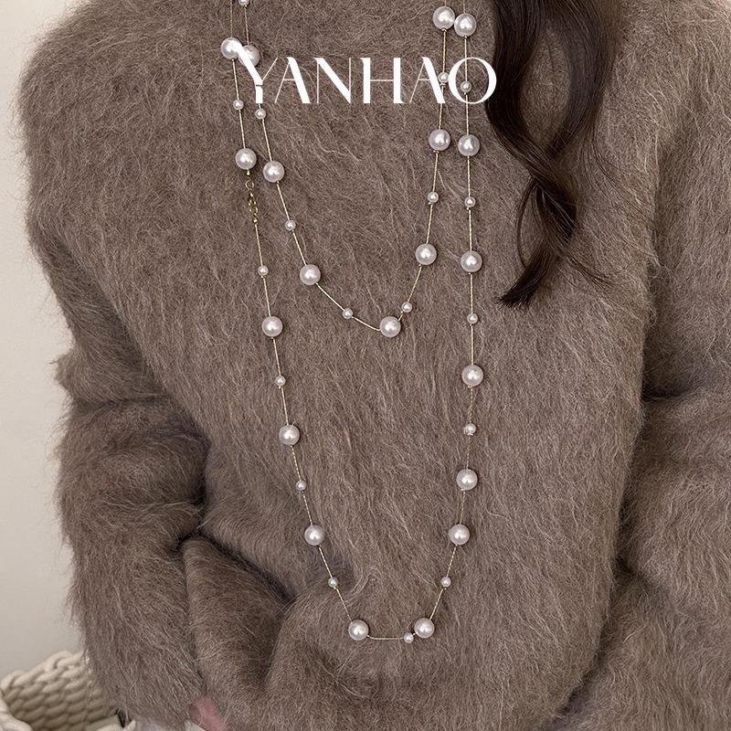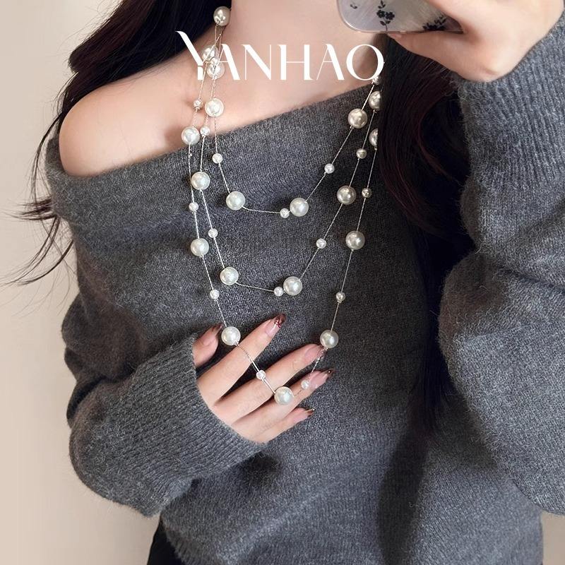 Collana lunga a strati di perle bianche a più strati stile coreano catena di felpe a catena maglione da donna