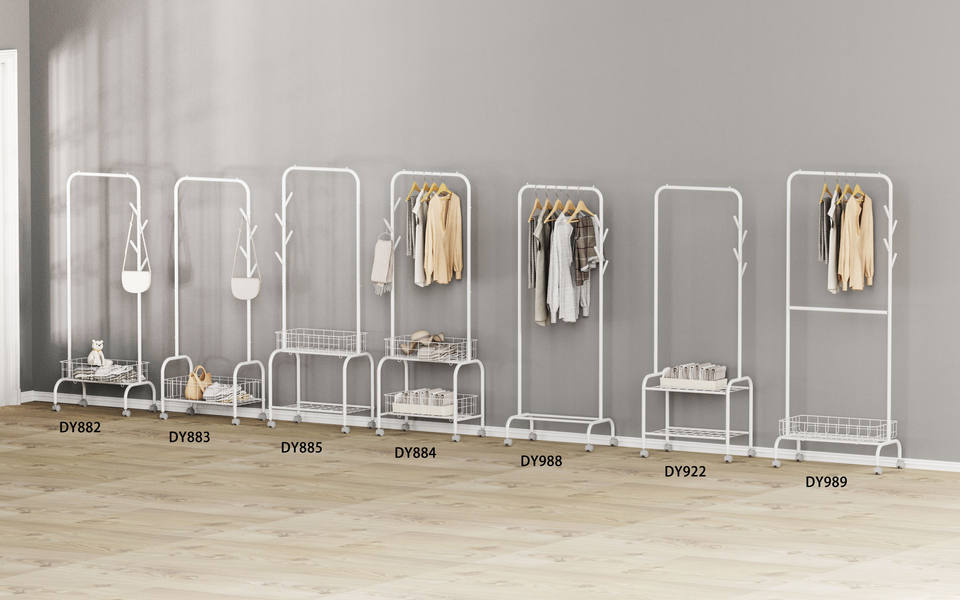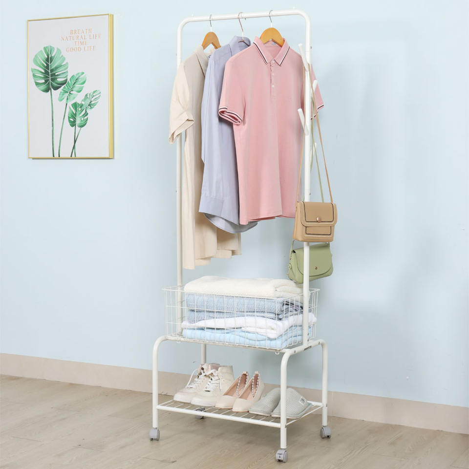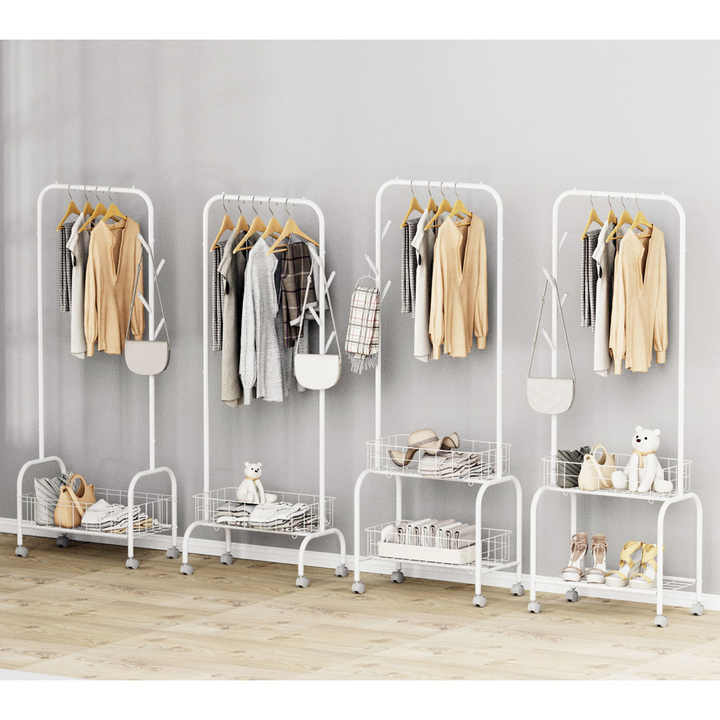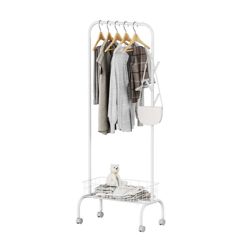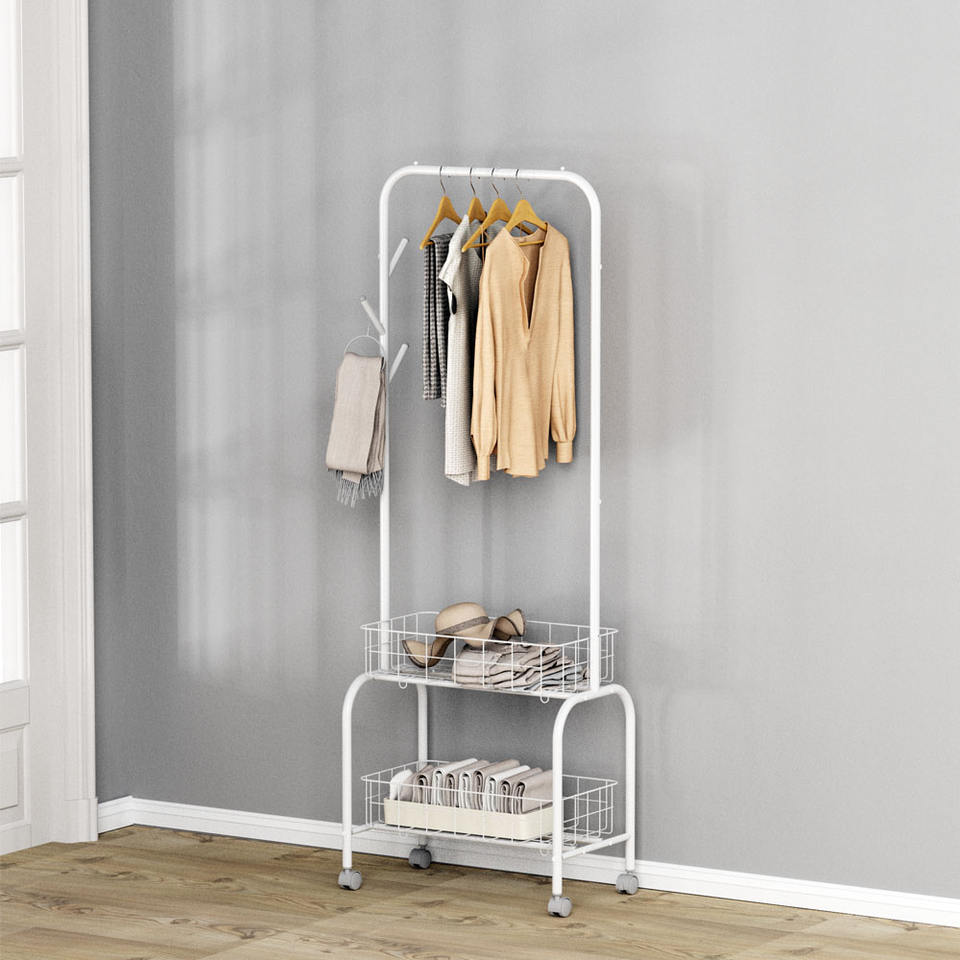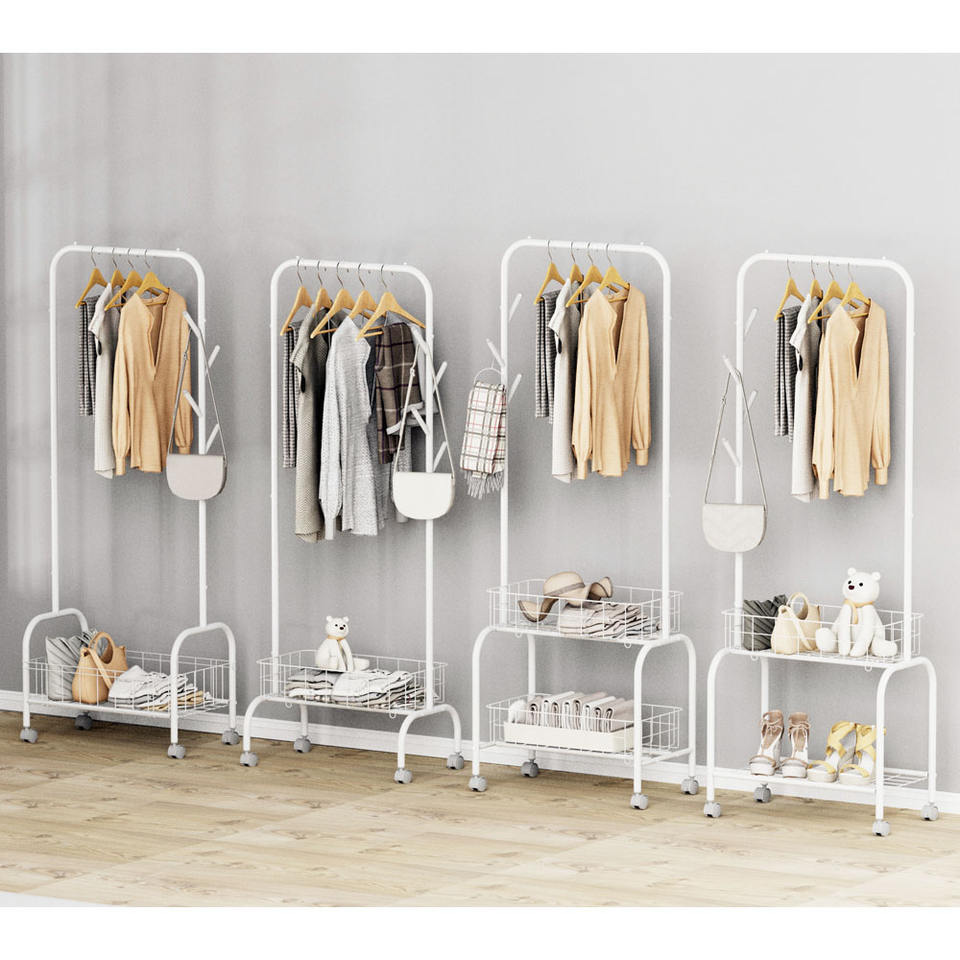 Stile coreano multifunzione in metallo bianco appendiabiti con ruote chiudibili a chiave in piedi porta abiti con cestini portaoggetti in piccolo posto