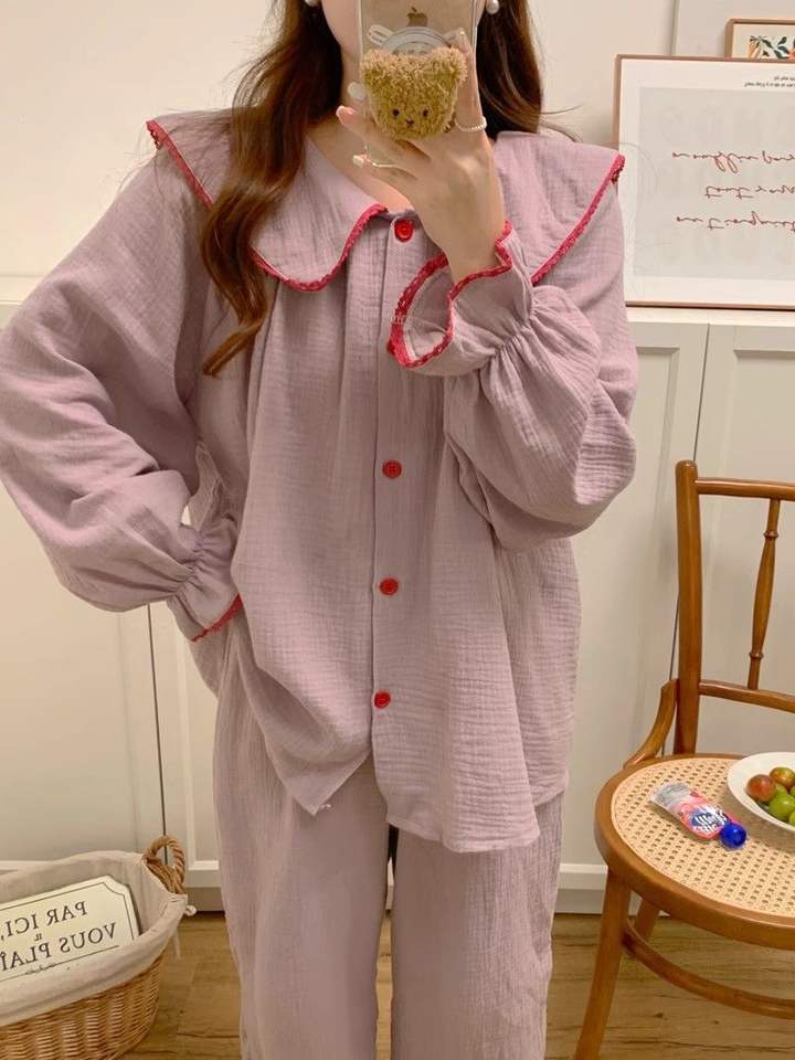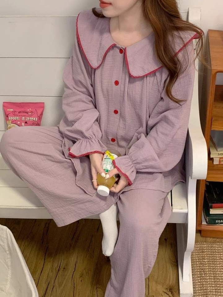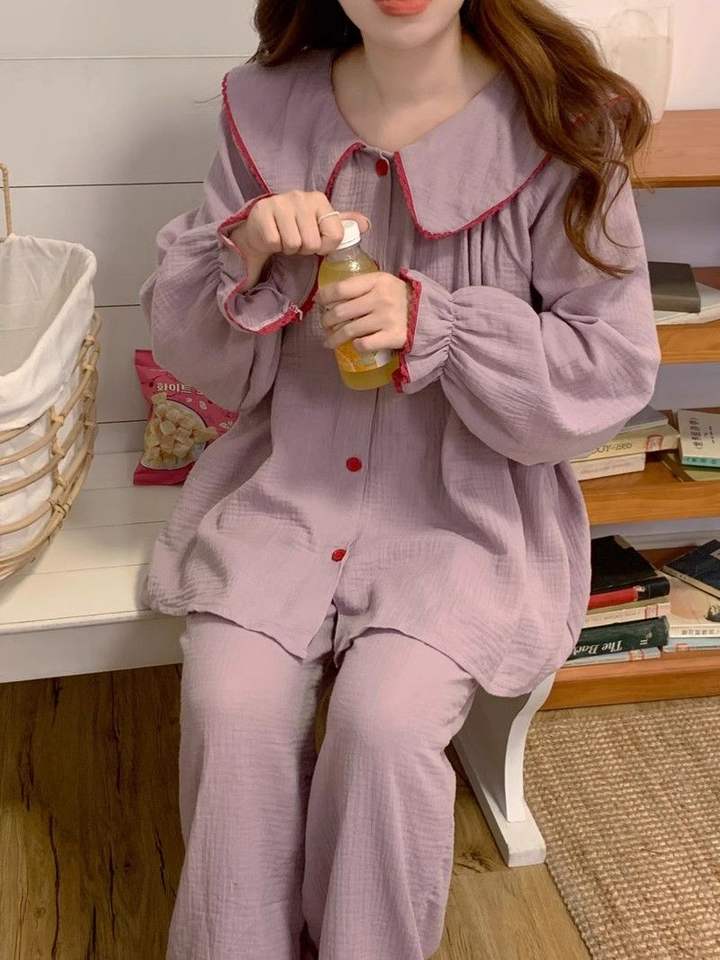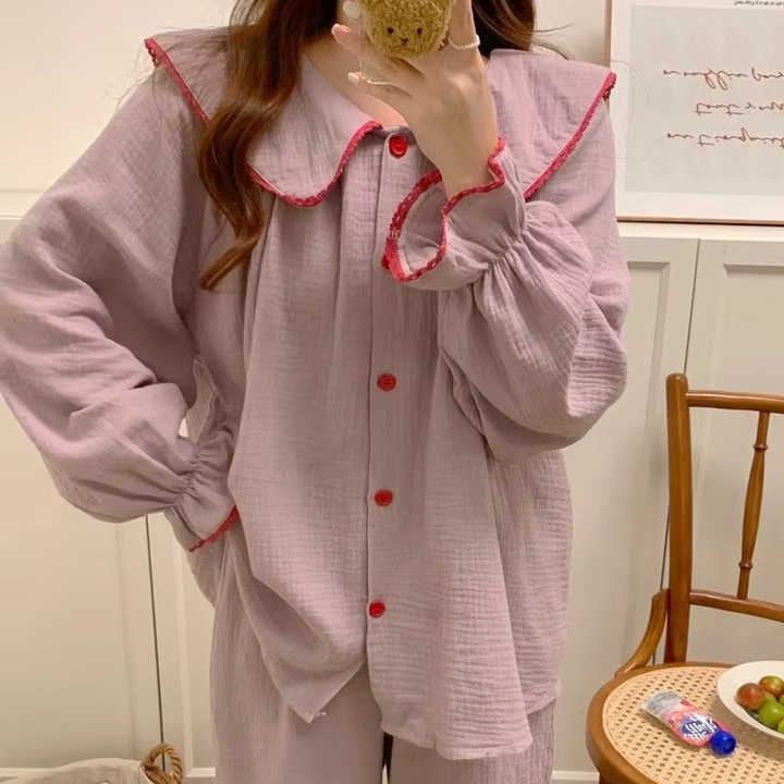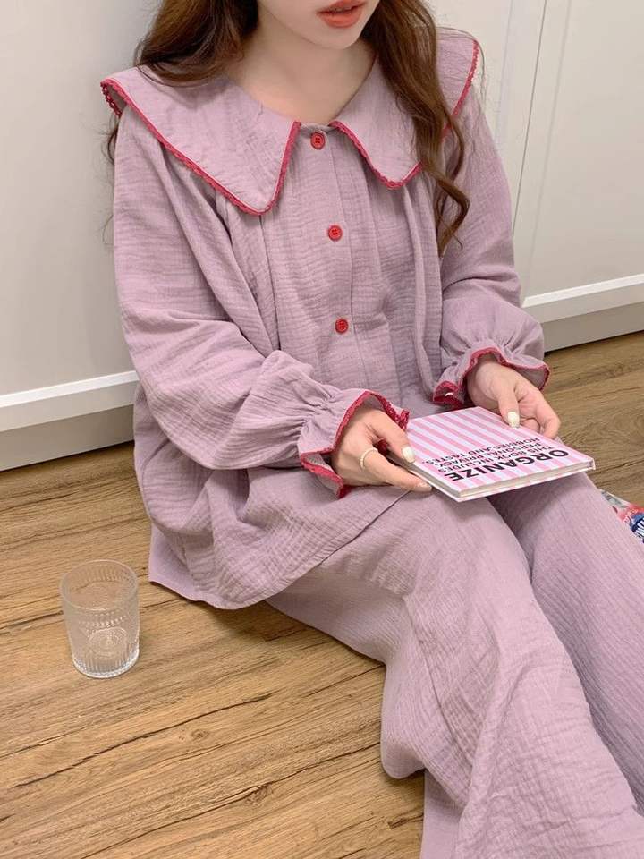 Korean Style Sleepwear Big Lapel Pajamas Sets Cotton Long Sleeve Nightgowns 2024 New Sweet Solid Girl Trendy Sleepwear