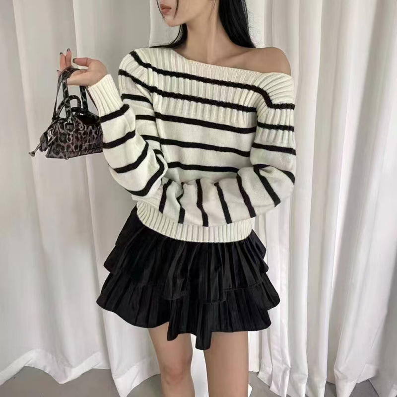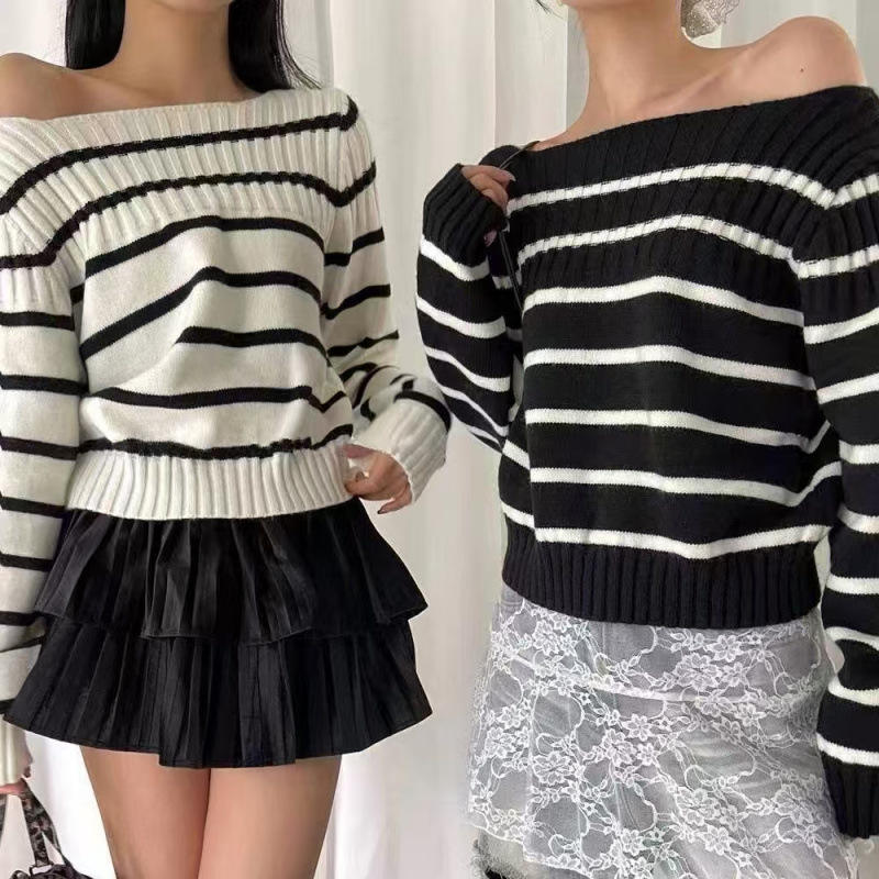 Maglione Sottile da Donna in Stile Coreano, Giovanile e Casual, con Spalle Scoperte e Strisce a Contrasto, in Acrilico/Spandex, Primaverile Retrò