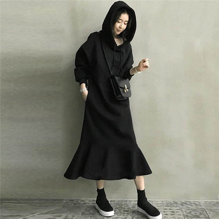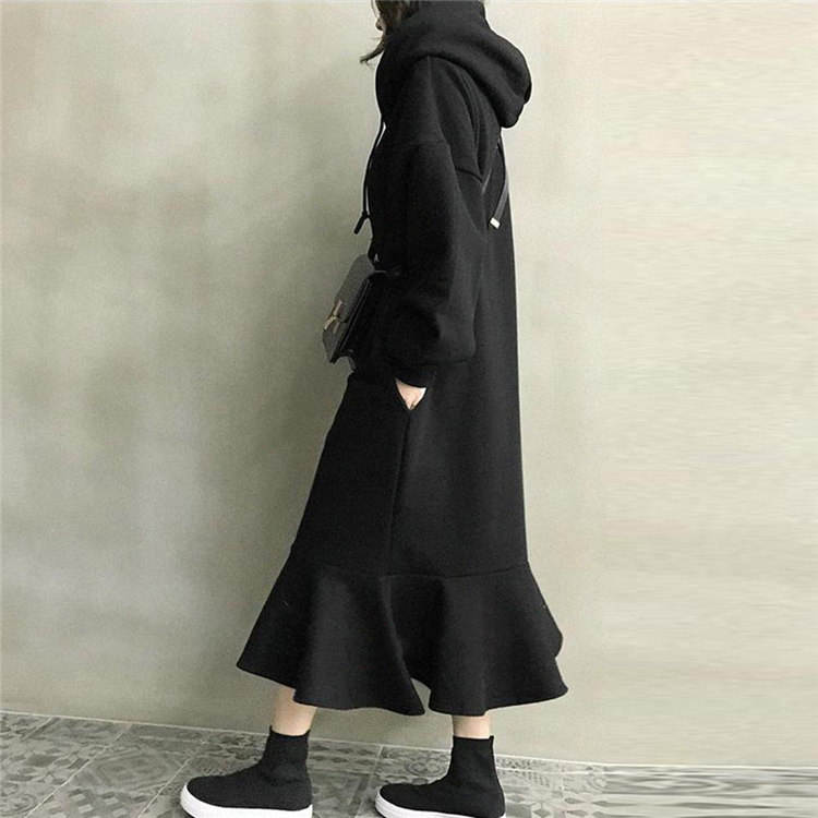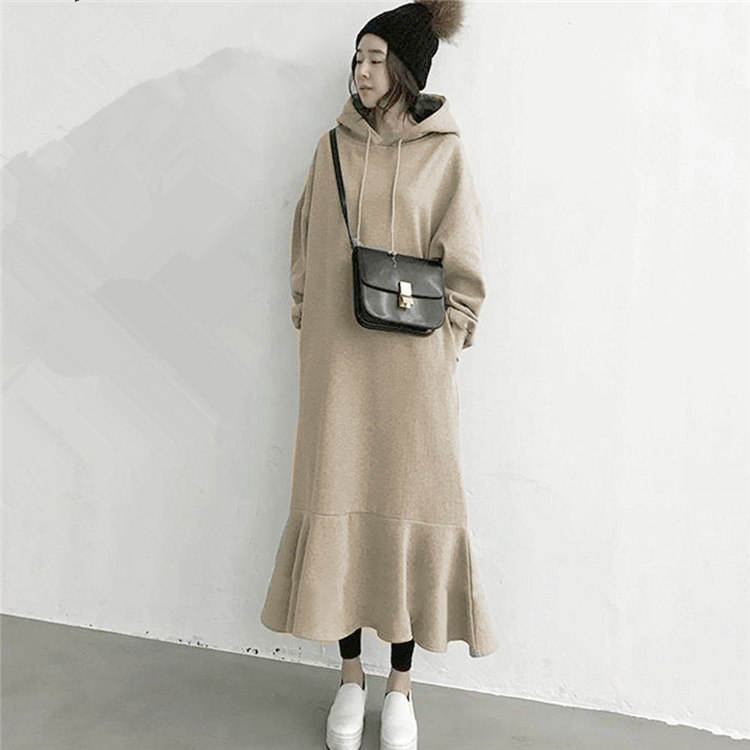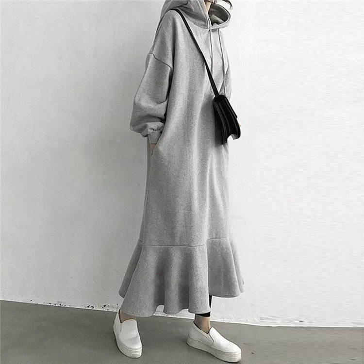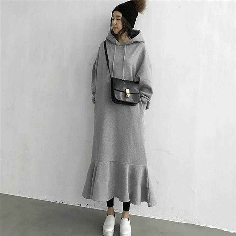 Coreano di Inverno del Panno Morbido di Colore Solido Increspato Lunga Felpata Delle Donne Casuali di Grandi Dimensioni A Maniche Lunghe Con Cappuccio Maxi Felpe Abiti