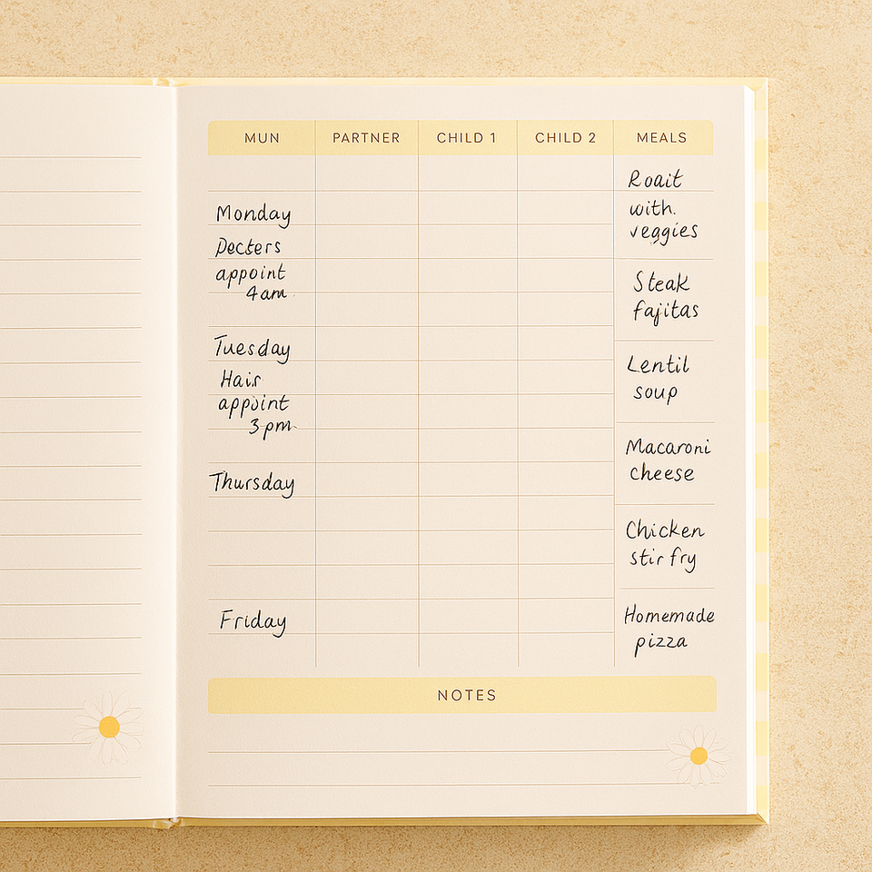 LABON Daisy Family Planner settimanale con copertina rigida Organizer con strisce gialle e copertina floreale per la pianificazione della casa e la pianificazione dei pasti