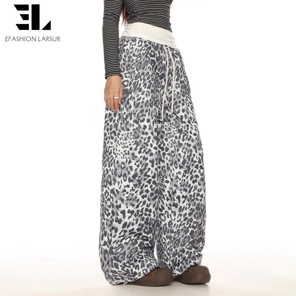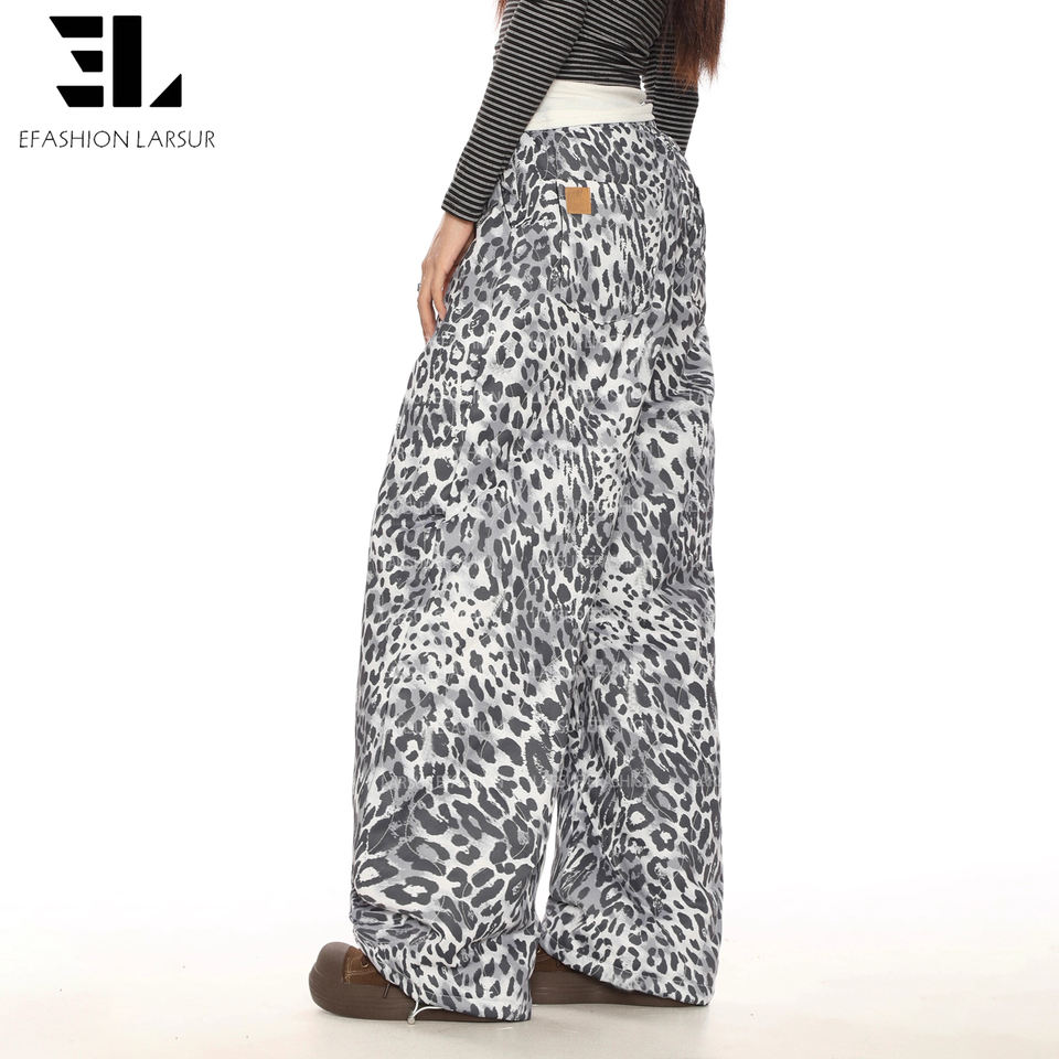 Pantaloni Larghi LARSUR Personalizzati in Twill di Cotone con Stampa Leopardata e Camouflage, Jeans Classici a Gamba Larga e Dritta per Donna