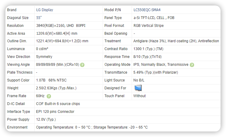 LC550EQC-SMA4 LG 55 inch TV screen replacement 4K UHD high brightness LCD display panel Open Cell 3840x2160