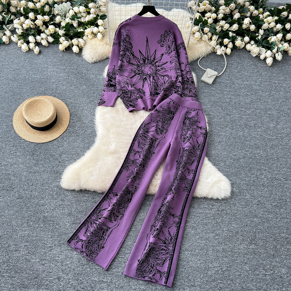 LE4688 Women'S Fashion Suit With Crew-Neck Long Sleeve Jacquard Sweater Sweater High Waist Casual Wide Leg Pants