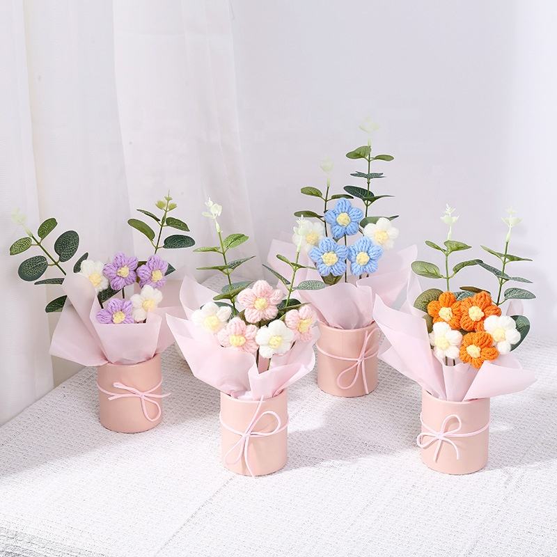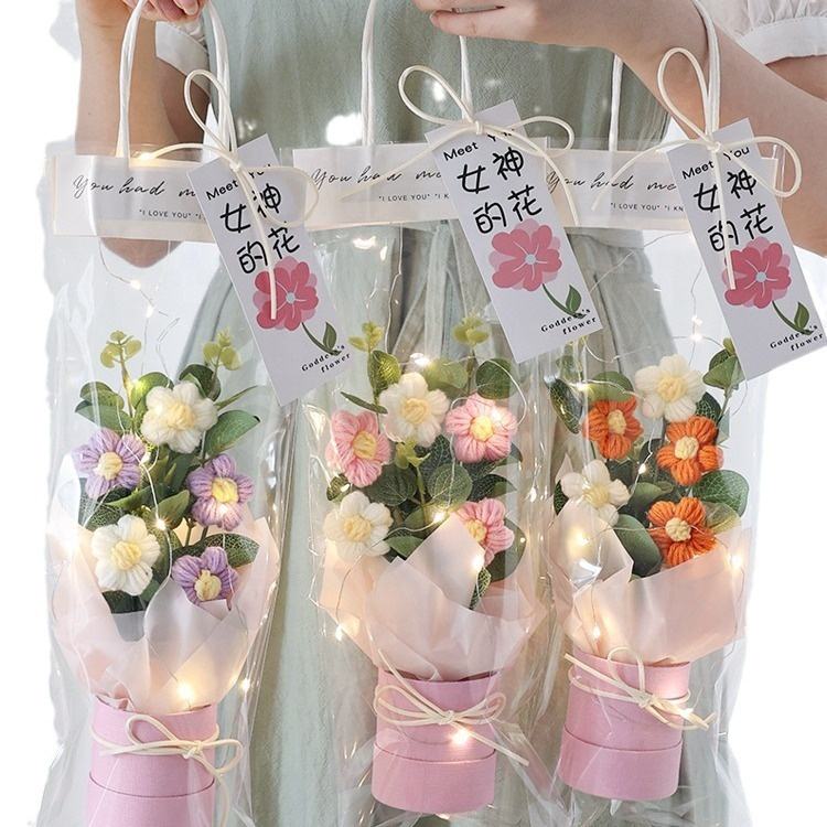Bouquet di Fiori Lavorati a Mano in Miniatura con LED, Fiori all'Uncinetto per Laurea, Festa della Mamma, San Valentino, Regalo per Bambini