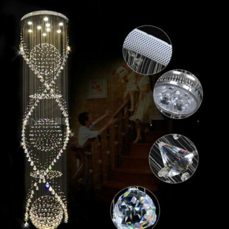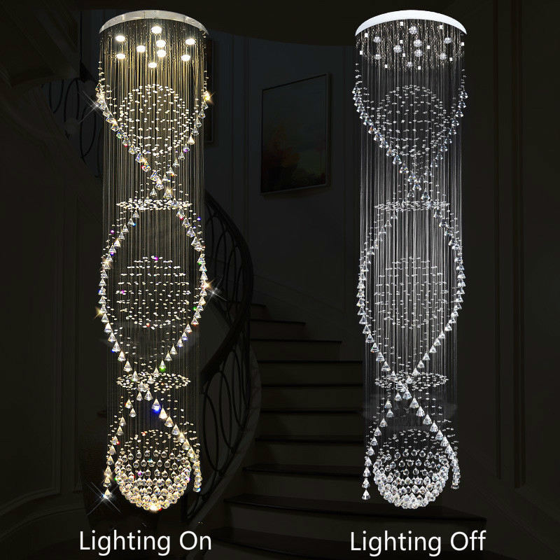 Lampadario a Spirale Doppia Elica in Cristallo K9 e Acciaio Cromato con Gocce di Pioggia, Diametro 80cm Altezza 280cm per Scale