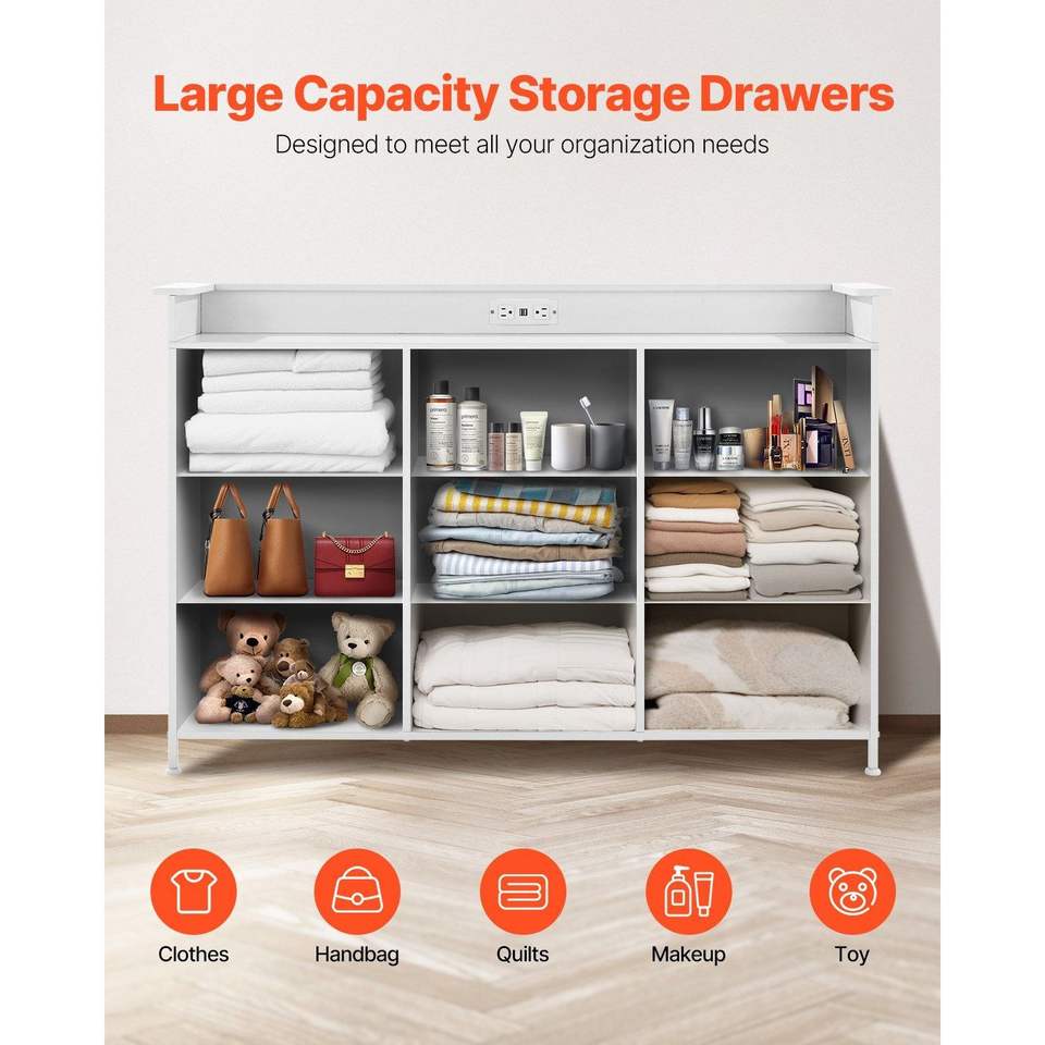 Comò alto a 9 cassetti con luci LED integrate, contenitori in tessuto e robusto telaio in metallo per l'organizzazione dell'armadio