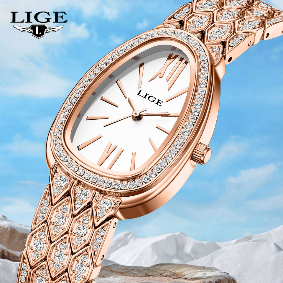 LIGE LG89275 Oval Rose Gold Bracelet Steel Iced Out Roman Watch for Women Female Elegant Quartz Diamond Vintage Watch for Girls