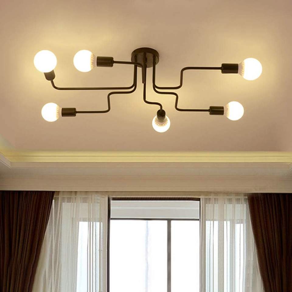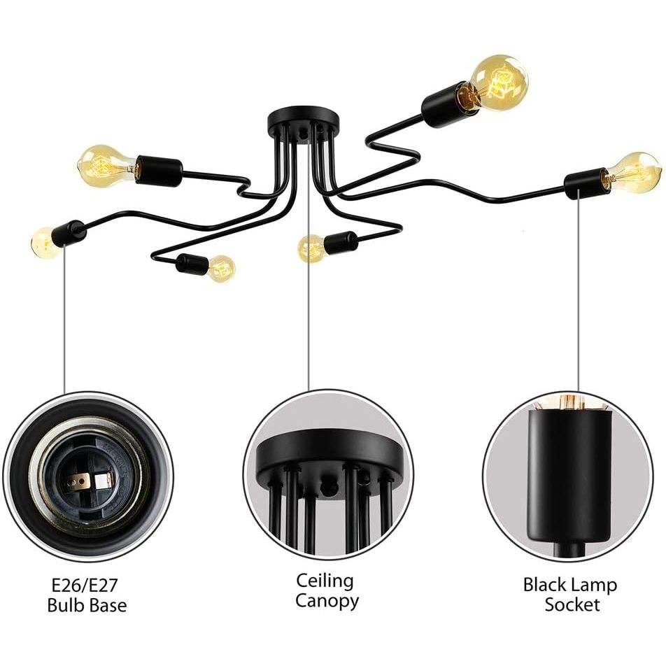 LITFAD 32\" Industrial Vintage Metal Chandelier 6-Light Semi Flush Mount Ceiling Light Fixture Chrome Barn Wrought Iron Hanging