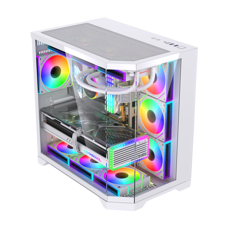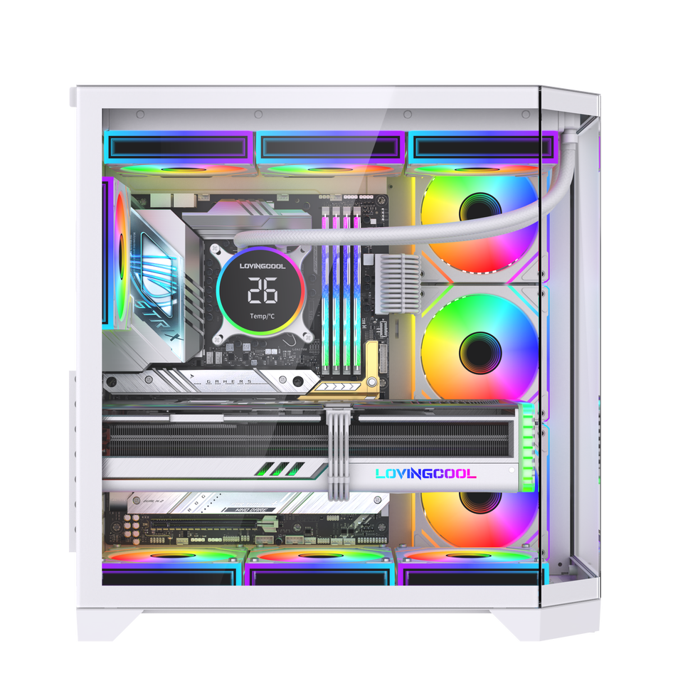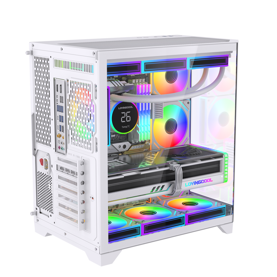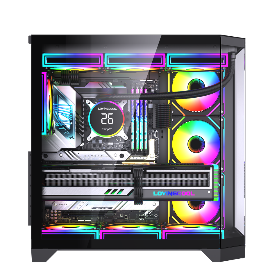 LOVINGCOOL Case PC con Schermo di Intrattenimento Oversize, Cubo in Vetro con Vista Panoramica, Cabinet per Computer ATX, Torre per Giochi con Raffreddamento a Liquido