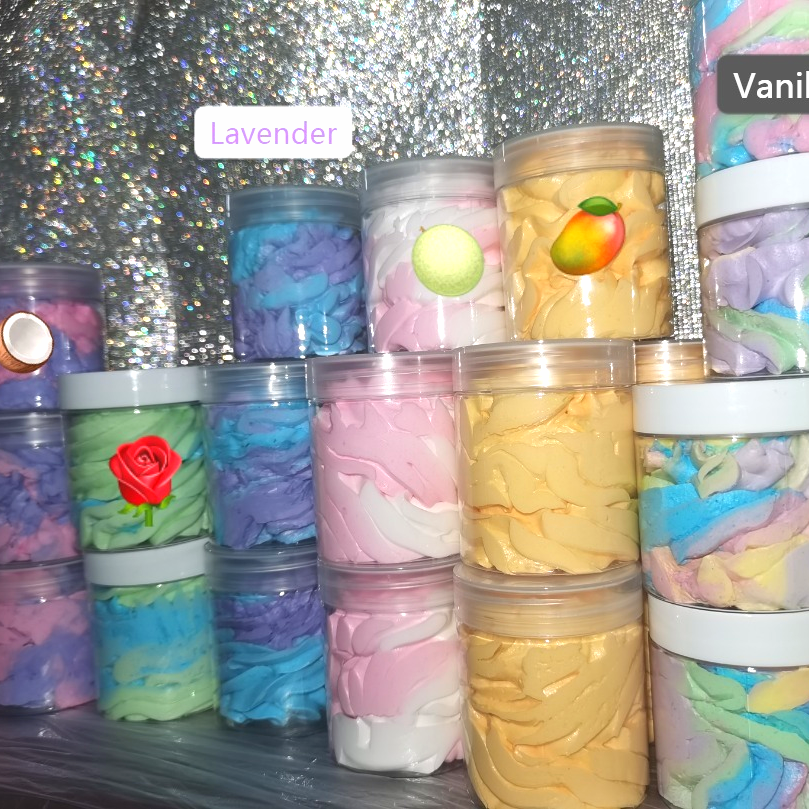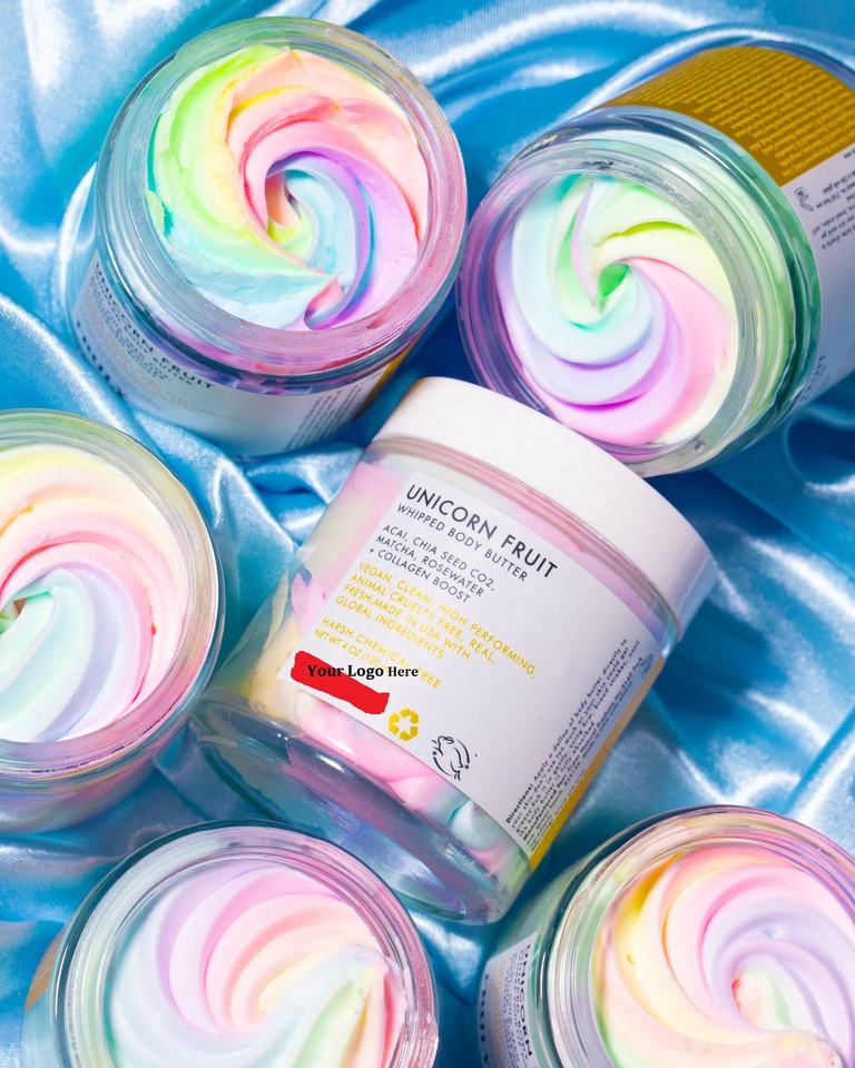 Basso MOQ personalizza il colore disponibile all'ingrosso profumi di frutta a marchio privato burro di karité arcobaleno burro per il corpo montato