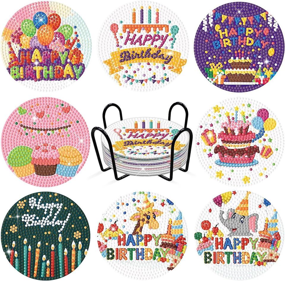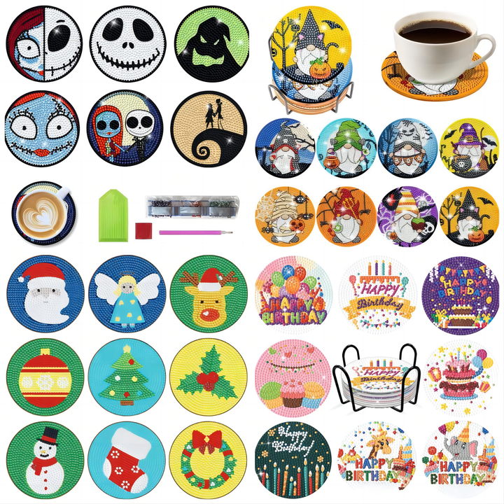 LS DIY 6-Piece Set of Printed Coaster Cartoon Animal Goblin Pattern Dotted Diamond Craft Coaster with Metal Holder