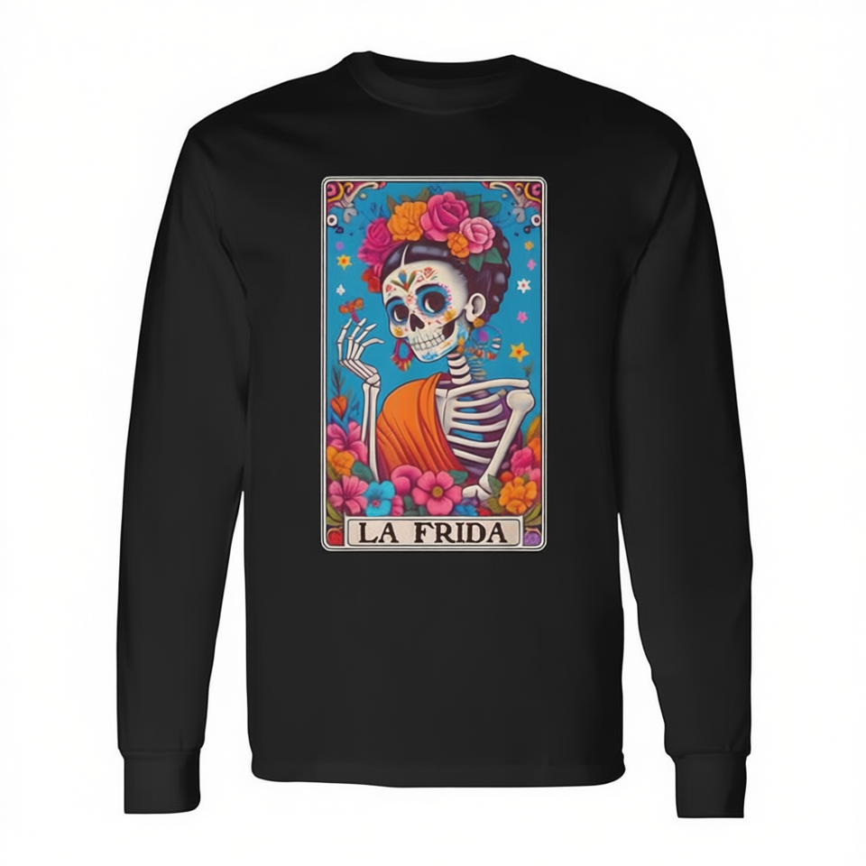 T-shirt a maniche lunghe con stampa teschio La Frida Dia De Los Muertos, design per Halloween e Giorno dei Morti