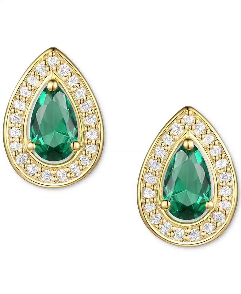 Smeraldo coltivato in laboratorio (1/3 ct. T. w.) & Zaffiro bianco coltivato in laboratorio (1/6 ct. T. w.) Orecchini a bottone pera Halo in sterline placcata oro 14k S