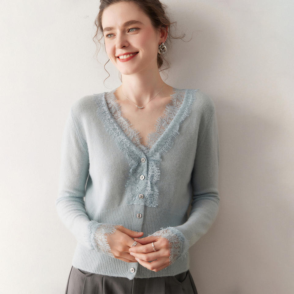 Lace Trim Cashmere Cardigan for Women V-Neck Short Sweater Coat Knitted Wool Cardigan Long Sleeve Autumn Winter New Style