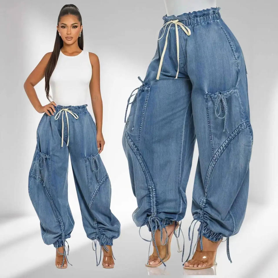 Lace Up Wide Leg Denim Cargo Pants