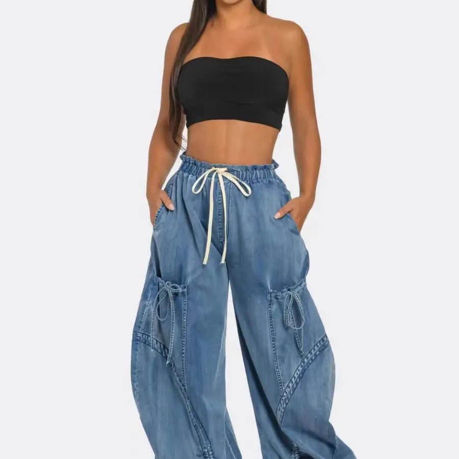 Pantaloni Cargo in Denim con gambe larghe allacciate