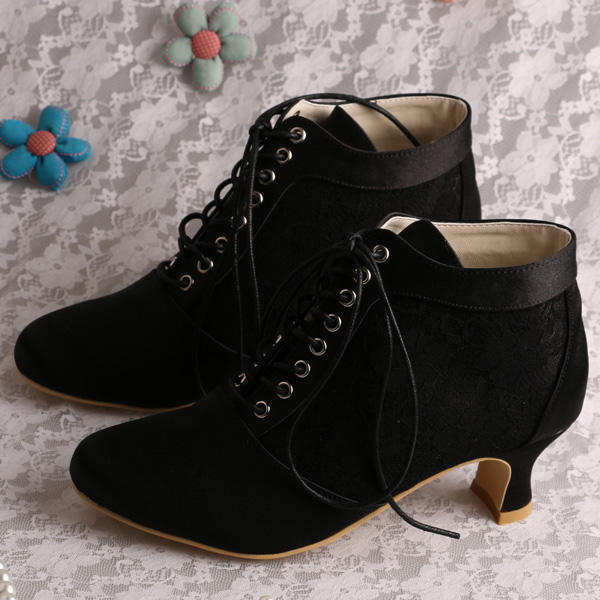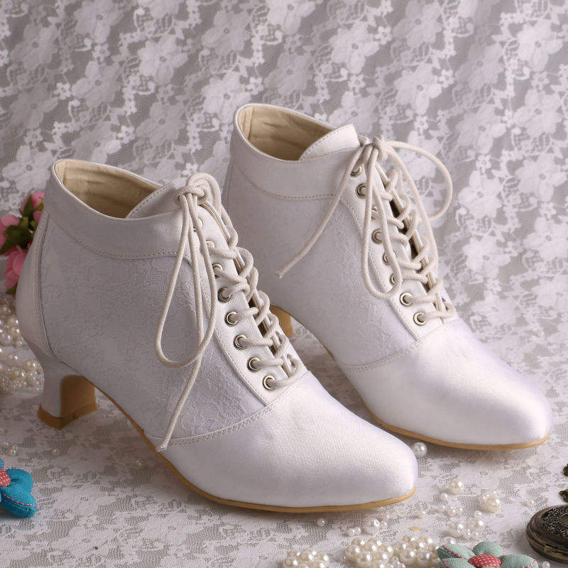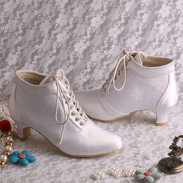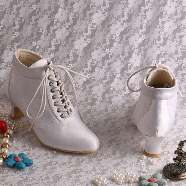 Lace and Satin White Ankle Boots for Women with Shoelace