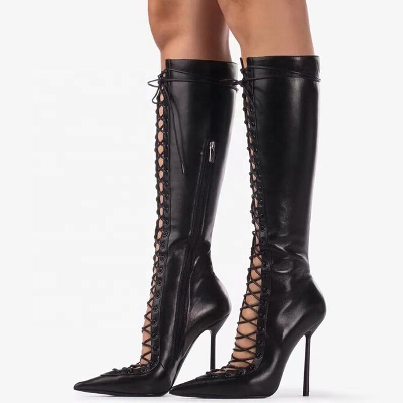 Stivali al ginocchio stringati con ritagli, tacco a spillo 10 cm, cerniera laterale, tomaia PU suola gomma, taglie EU35-44, 2 paia