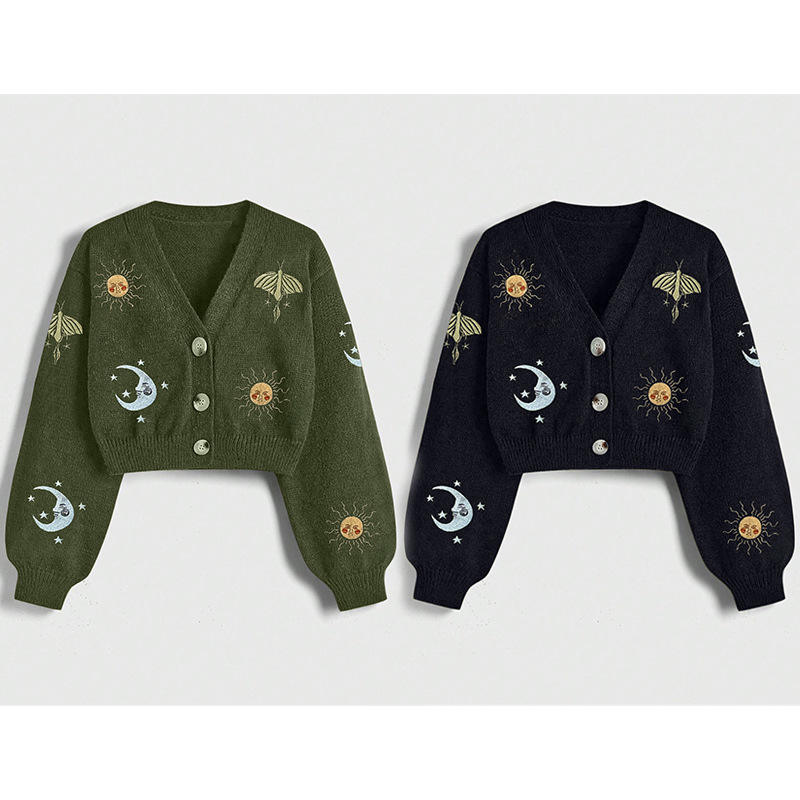 Cardigan in Maglia con Bottoni Ricamati da Donna Autunno Inverno Motivo Sole Luna Maniche a Lanterna Scollo a V