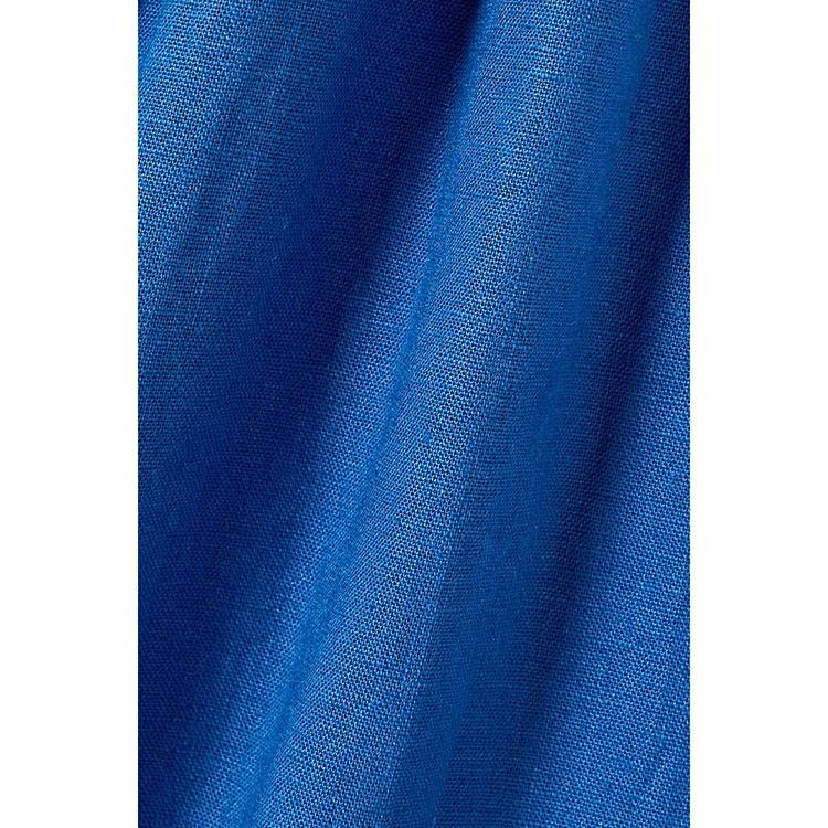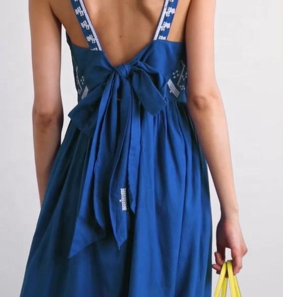 Abito da donna maxi in popeline di lino ricamato con motivo a fiocco blu cobalto con zip e bretelle