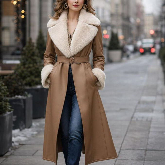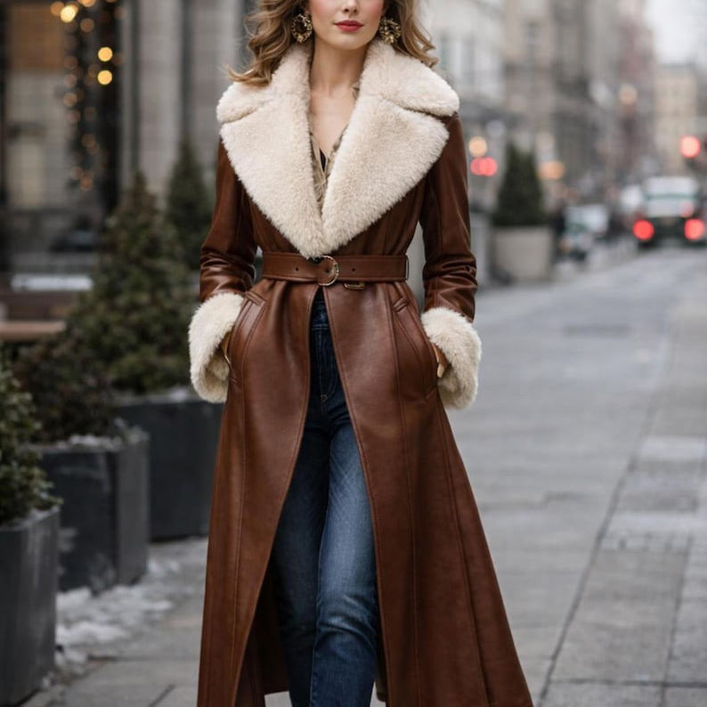 Cappotto lungo da donna in vera pelle, giacca esterna dal design moderno, realizzata con pelle naturale liscia, abbigliamento invernale caldo, stile moderno perfetto