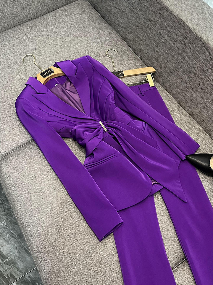 Lady Elegant Style Office Causal Suit Notched Long Sleeve Designed Ruffles Waist Blazer Flare Pants Women Solid 2pcs