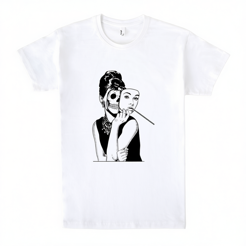 T-shirt con grafica Lady Skull, bianca, unisex, girocollo, design con stampa artistica, dichiarazione di moda