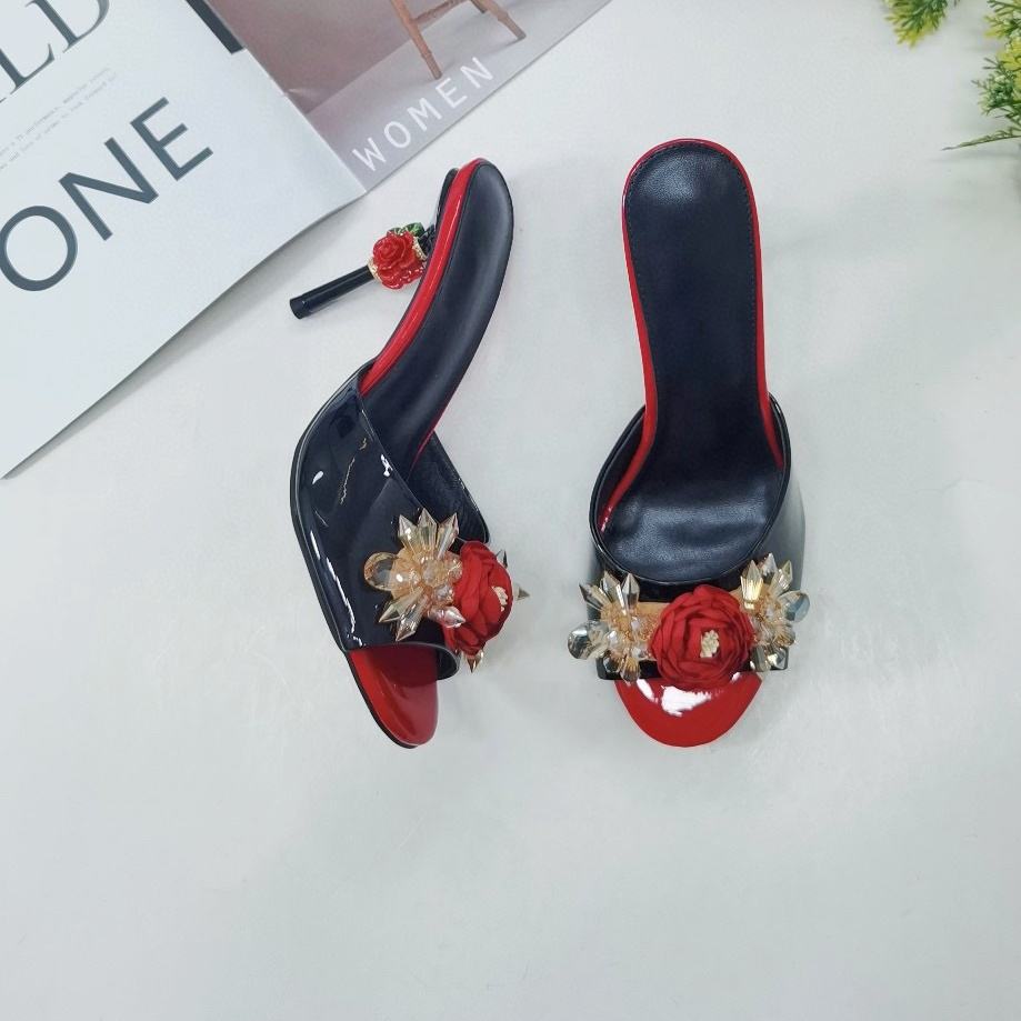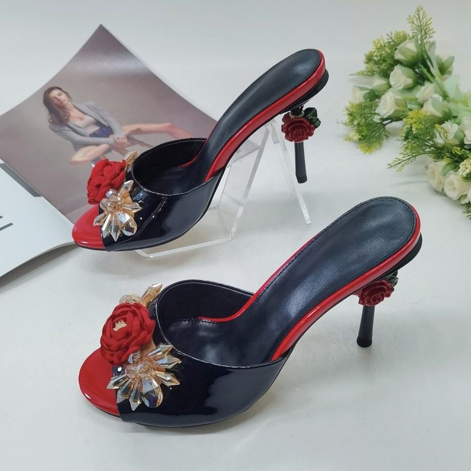 Lanfoo OEM/ODM nero Peep Toe forma tacco molto sottile signore estate nuovo Design fiore tacco alto sandali Mule scarpe sandali da donna