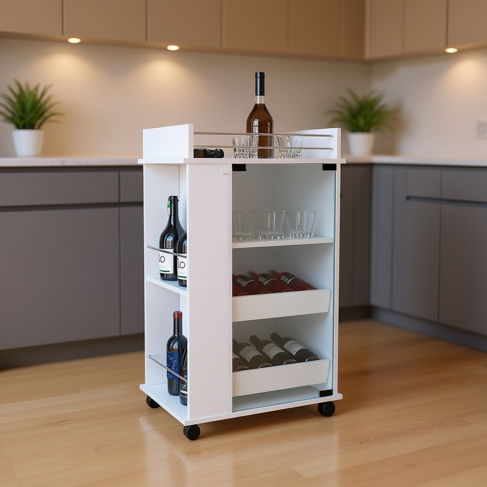 Carrello Bar Depot E-SHOP Bianco con Anta in Vetro, 2 Ripiani Laterali e Ruote - Design Moderno per Isola Cucina