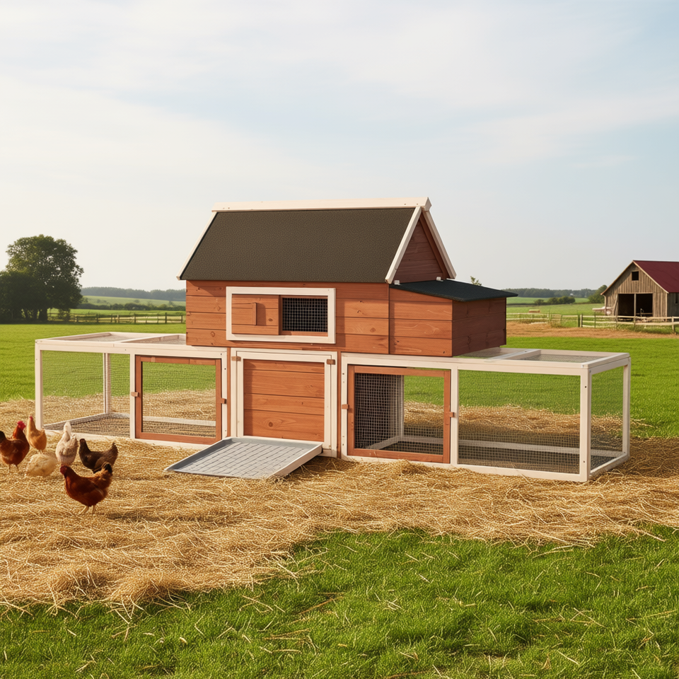 Large 114-Inch Cinnamon Brown Wooden Chicken Coop With Nesting Box Outdoor Runs Removable Tray Ramp