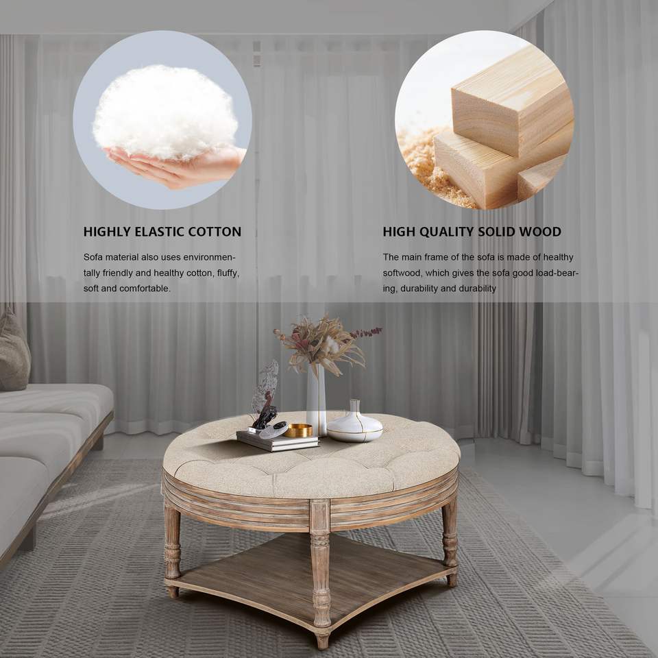 Grande tavolino da caffè ottomano a 2 livelli con ripiano in legno, stile rustico, imbottito con bottoni trapuntati