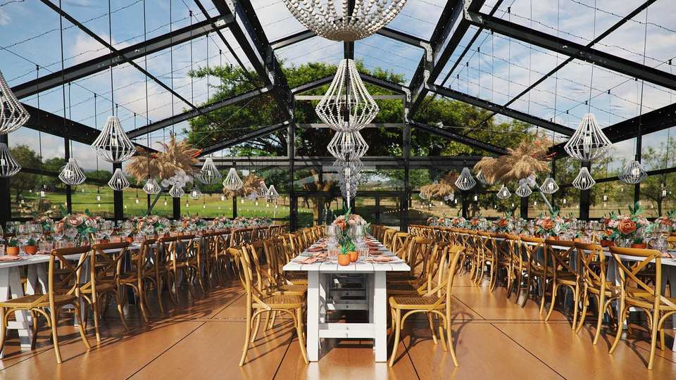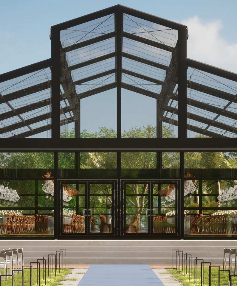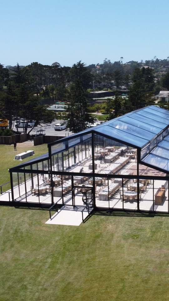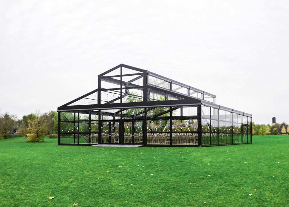 Grande Tenda per Eventi e Matrimoni a Forma di Atrio con Pareti in Vetro Trasparente, Capacità 500 Persone, Elegante Padiglione per Banchetti, Disegni di Progettazione Gratuiti Forniti