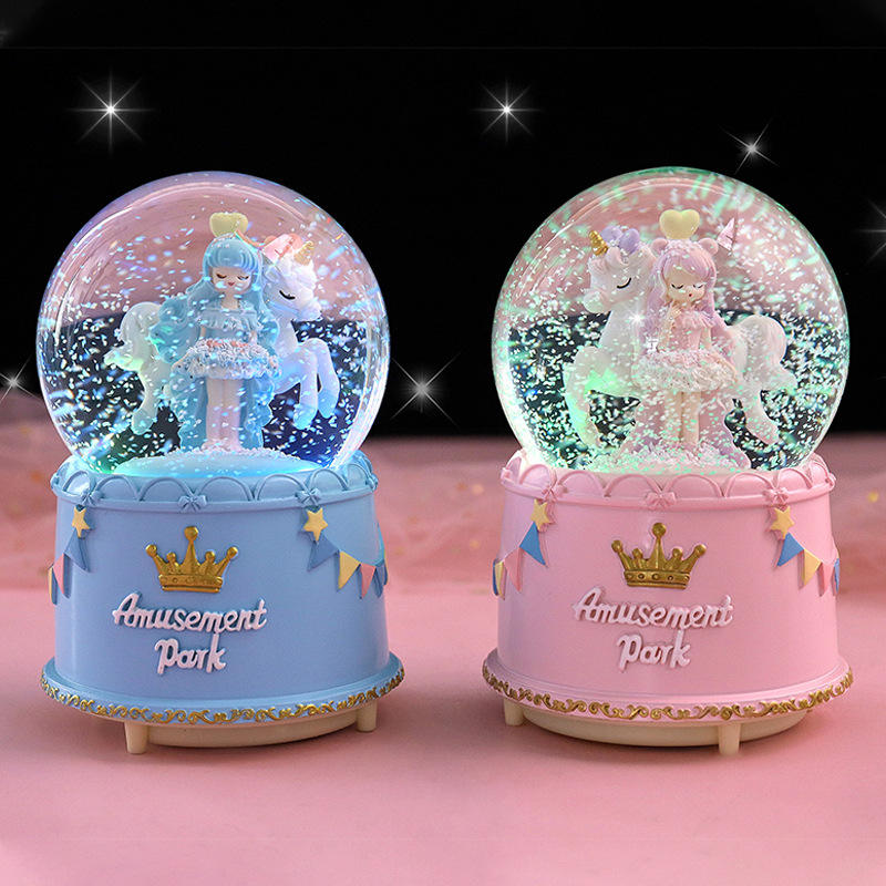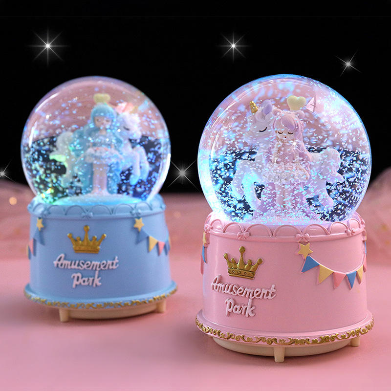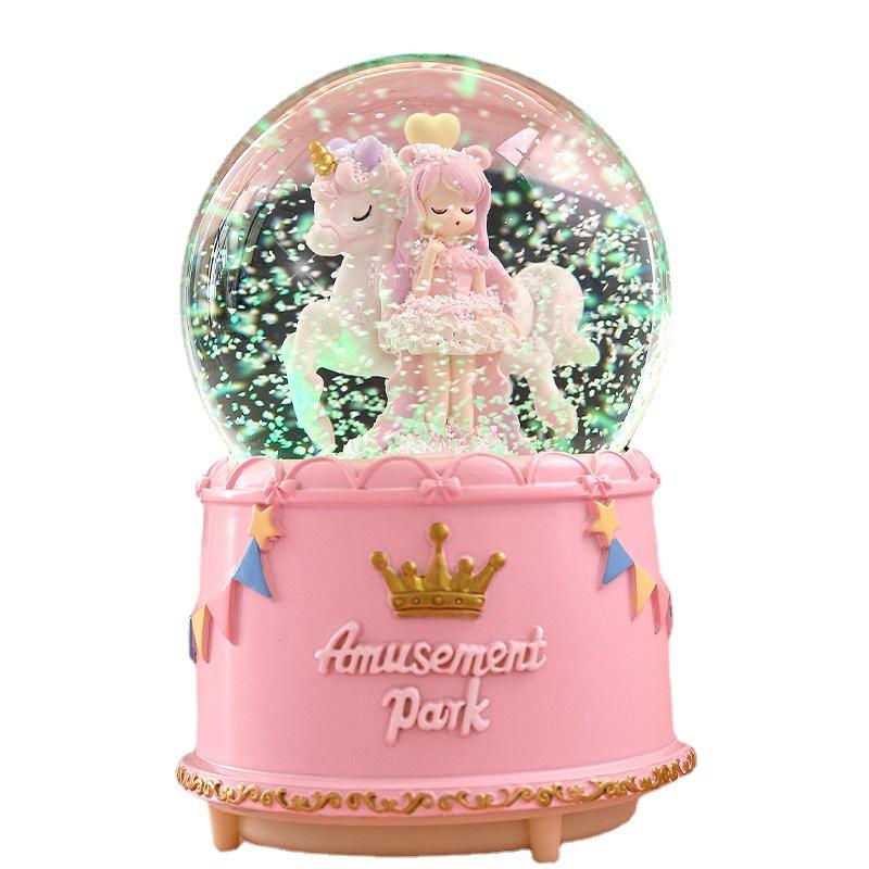Grande Sfera di Cristallo con Fiocchi di Neve Automatici, Carillon Musicale Decorativo con Luci Colorate, Regalo di Compleanno per Bambini a Tema Parco Divertimenti