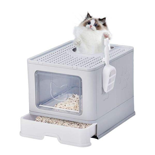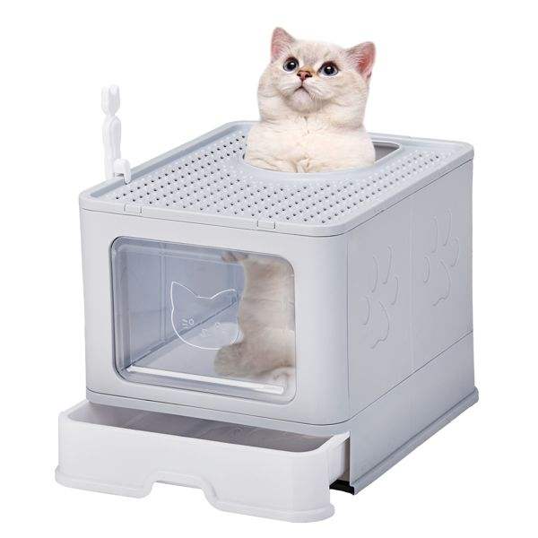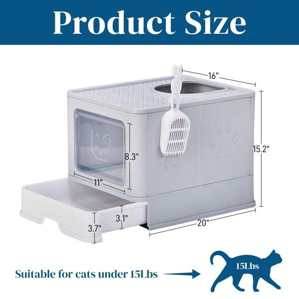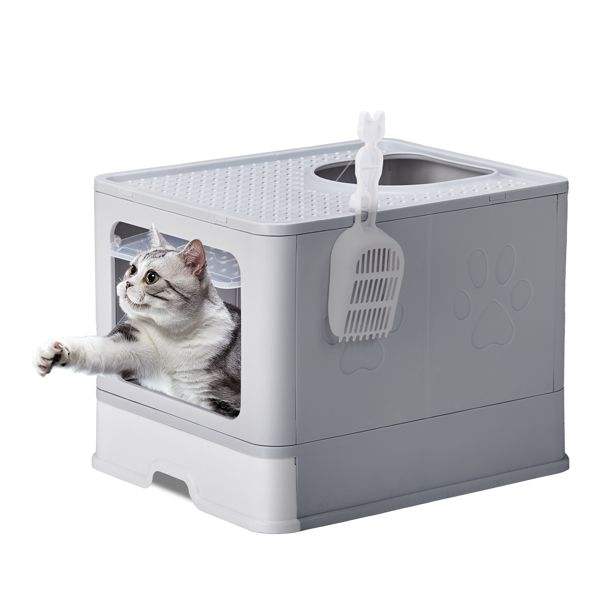 Large Gray Cat Litter Box Detachable Lid Easy Clean Front Entry Top Exit Door Scoop Slide Tray Enclosed Cat Toilet Accessory