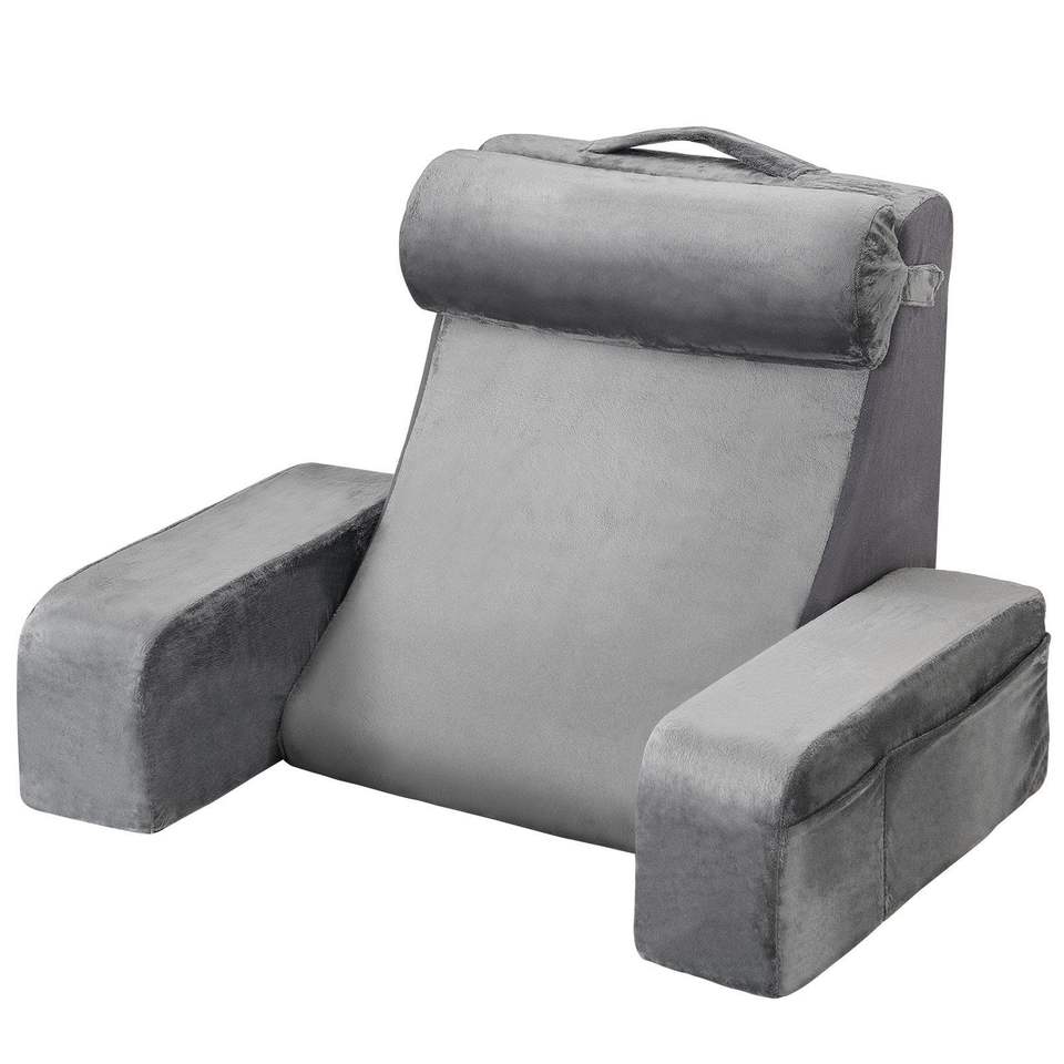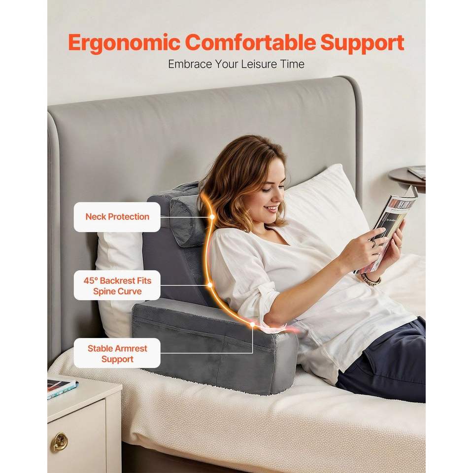 Cuscino Lettura e Riposo a Letto di Grandi Dimensioni con Poggiatesta Rimovibile, Supporto Schienale in Spugna 25D, 3 Tasche per Comfort e Praticità