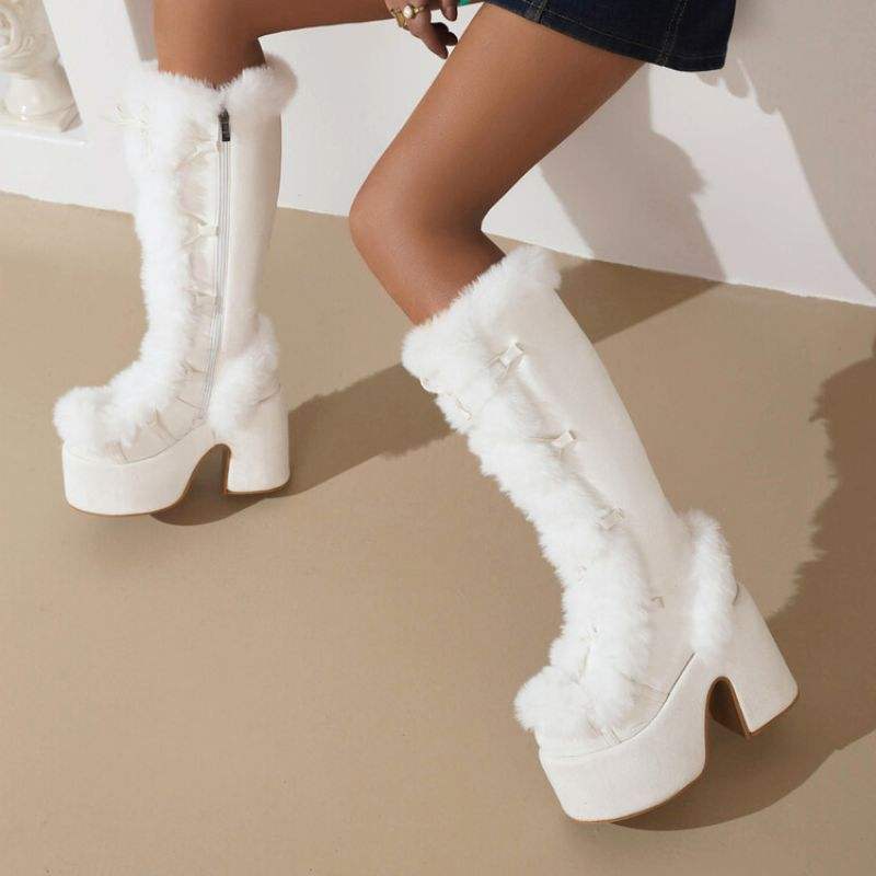 Fonleader Stivali donna al ginocchio GO-dlc38 con plateau e tacco chunky 17,5 cm, polpaccio largo, finta pelliccia, EUR34-46
