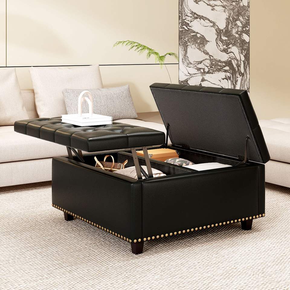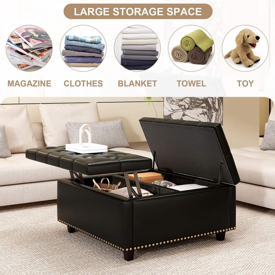 Grande Sgabello Contenitore Quadrato con Due Sportelli, Tavolino da Caffè Moderno Mid-Century, Poggiapiedi per Soggiorno in PU Nero