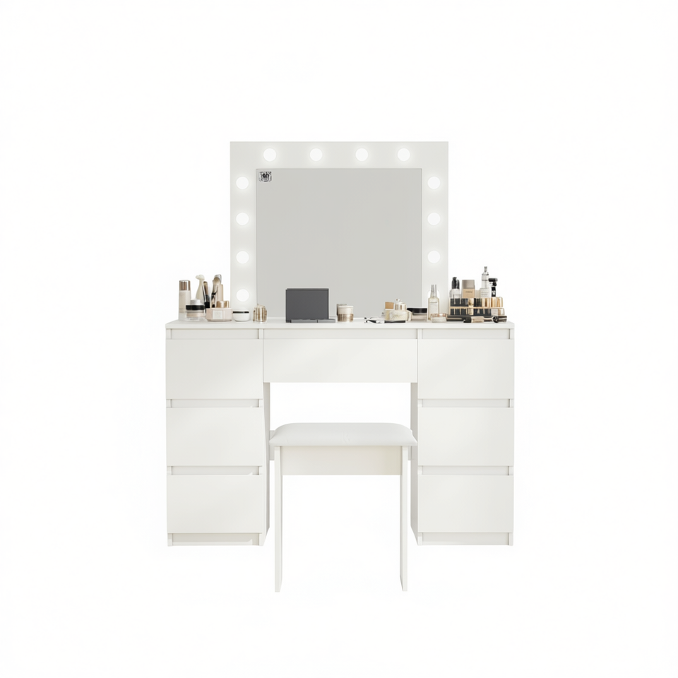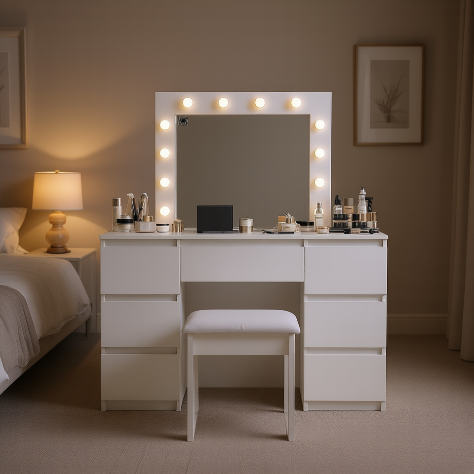 Toeletta bianca con specchio e luci per arredamento camera da letto