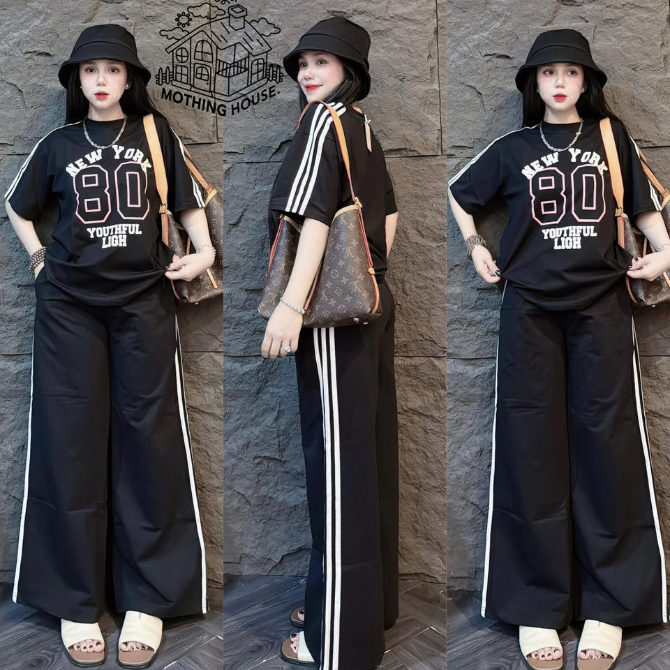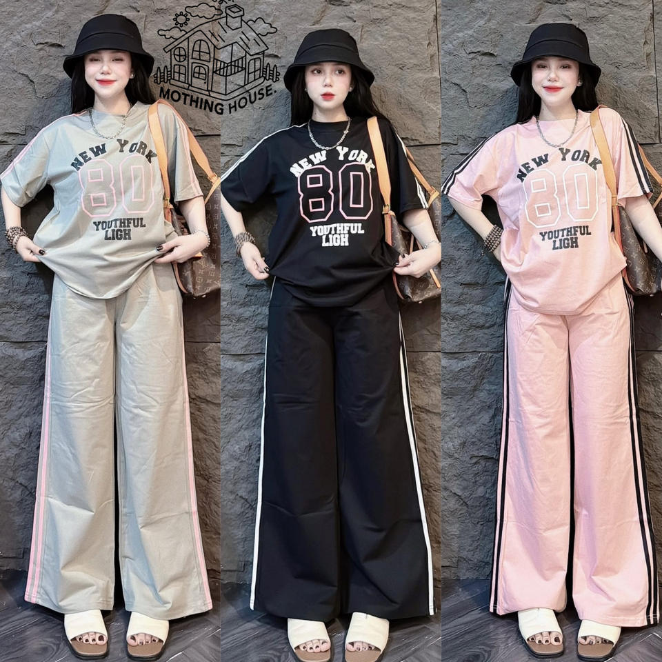 Completo donna 2 pezzi taglia grande: maglia e pantaloni gamba larga in milk silk, stampa lettere, busto 107cm vita 88cm