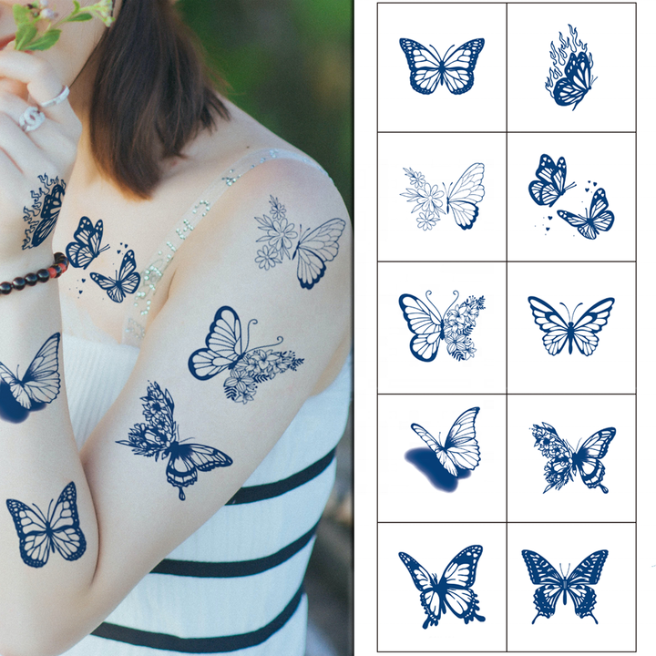 Della durata di 2 settimane di piccole dimensioni donne Sexy farfalla tatuaggio adesivi blu organico Jagua inchiostro temporaneo a base di erbe Semi permanente tatuaggio