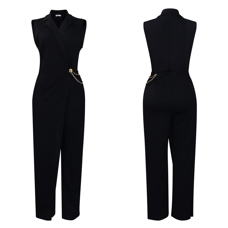 Latest Design Summer Jumpsuits for Ladies Elegant Suit Collar Waist Chain Loose Wide Leg One Piece Jumpsuit for Women