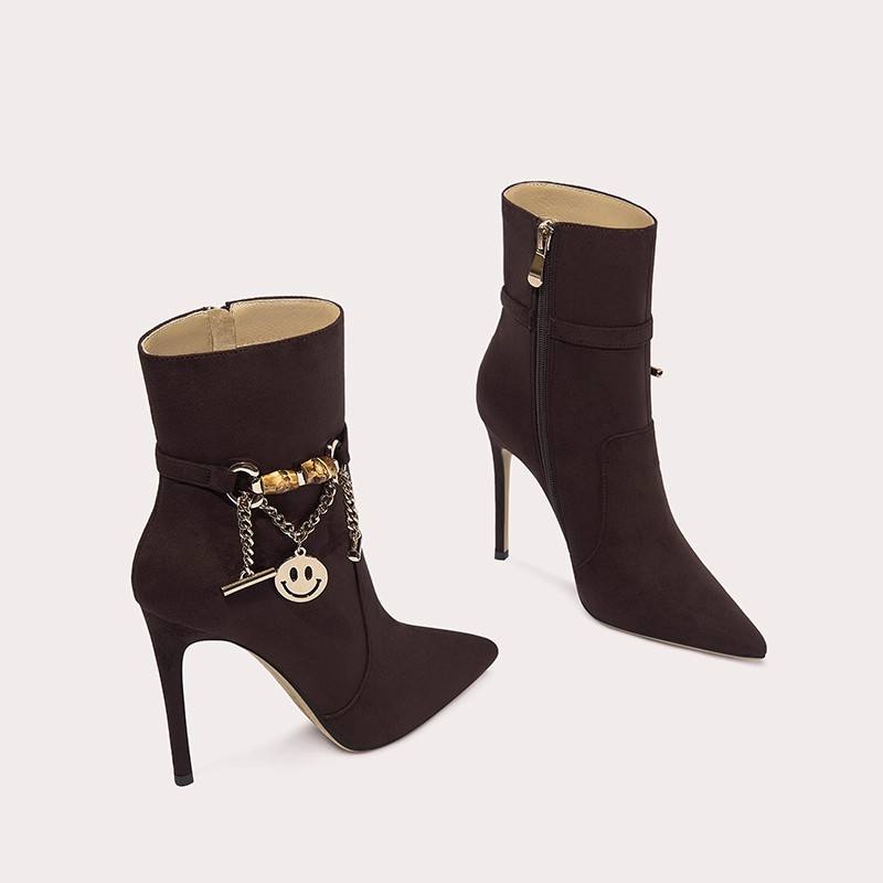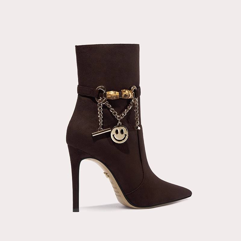 Stivali invernali di ultimo Design da donna in maglia con tacchi a punta con stivali a punta con catena Metail scarpe a metà polpaccio
