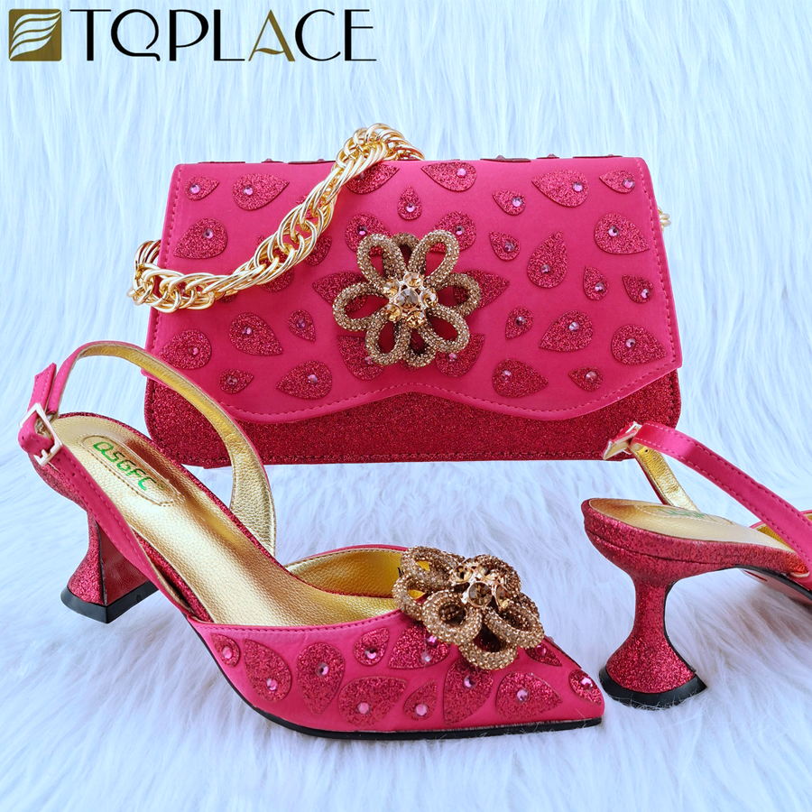 Ultimo Modello di Scarpe da Sposa con Tacco Basso e Set di Borse, Fibbia Floreale con Strass, Punta Affusolata per Donne Africane e Feste