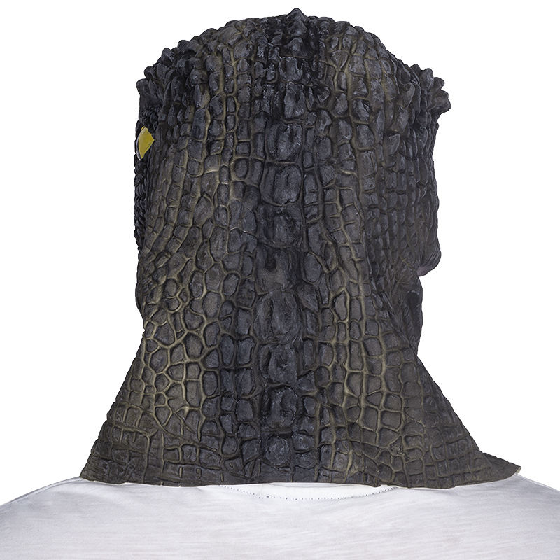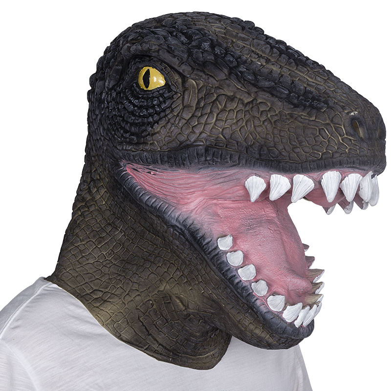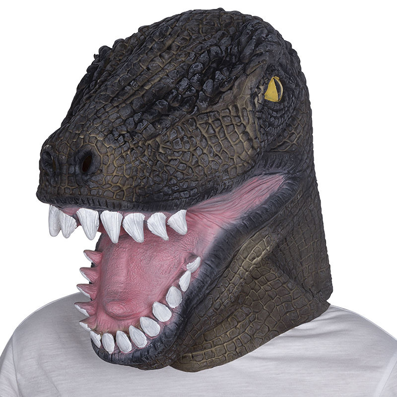 Maschera in lattice di dinosauro T-Rex a testa intera, marrone scuro, texture realistica squamatosa, occhi gialli, denti bianchi, bocca rosa aperta, morbida e confortevole