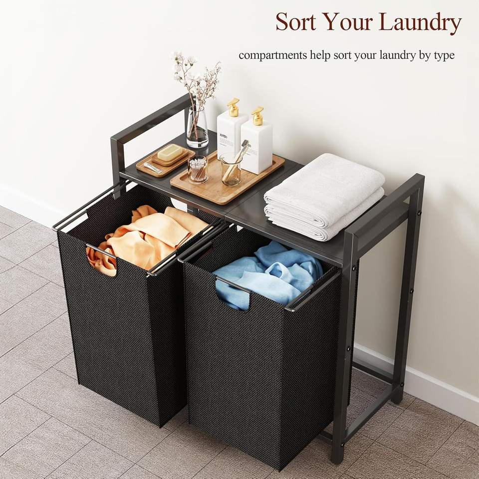 Organizzatore per Cesto Portabiancheria con 2 Sacchi Estraibili Rimovibili, Pratico Cesto Portabiancheria con Ripiano
